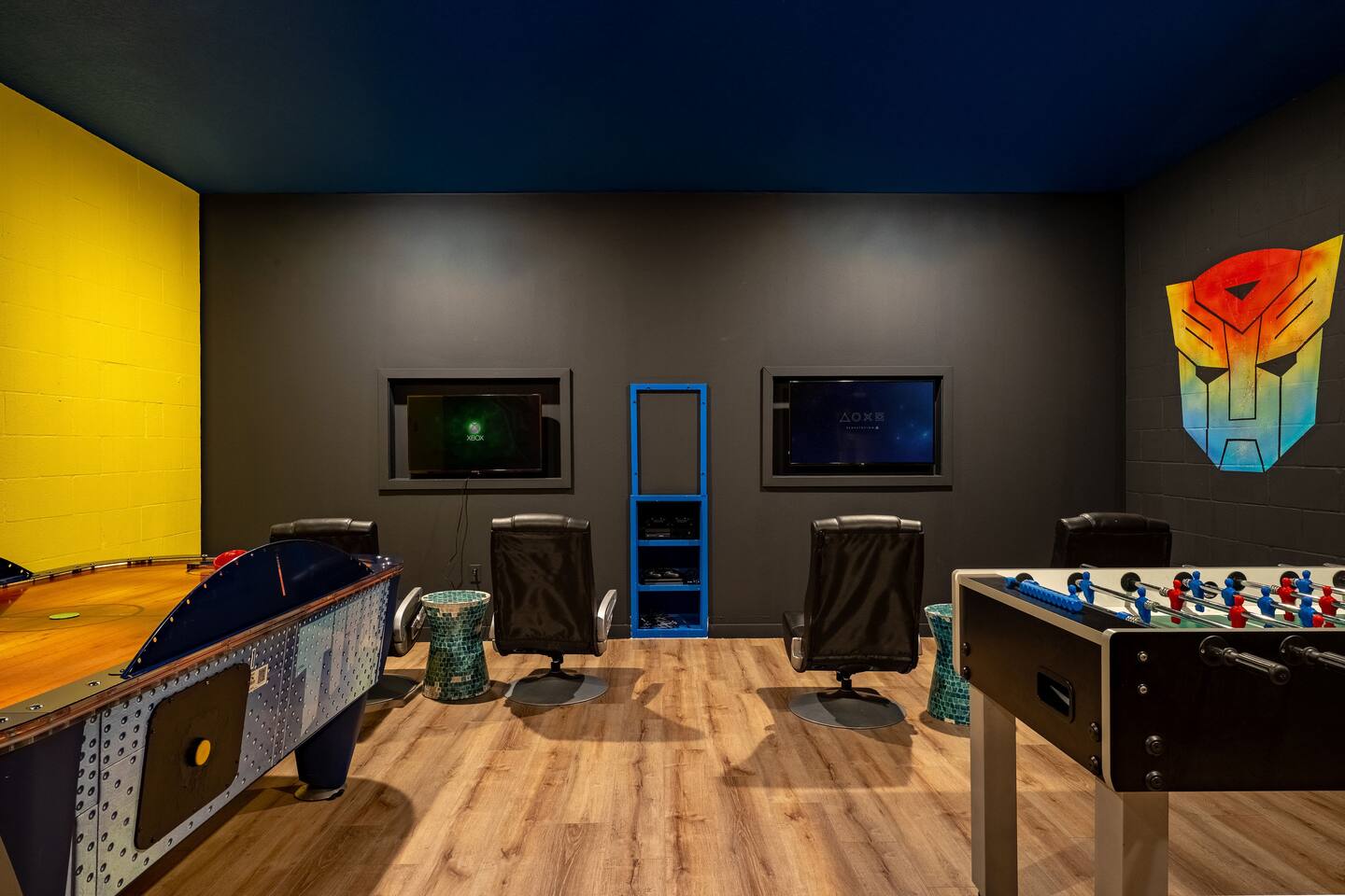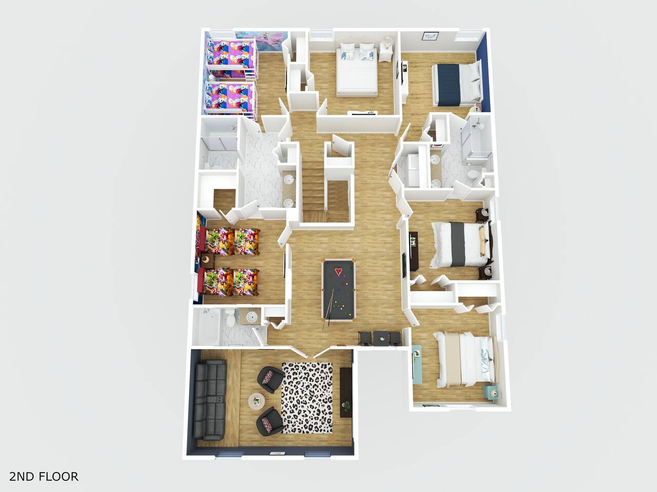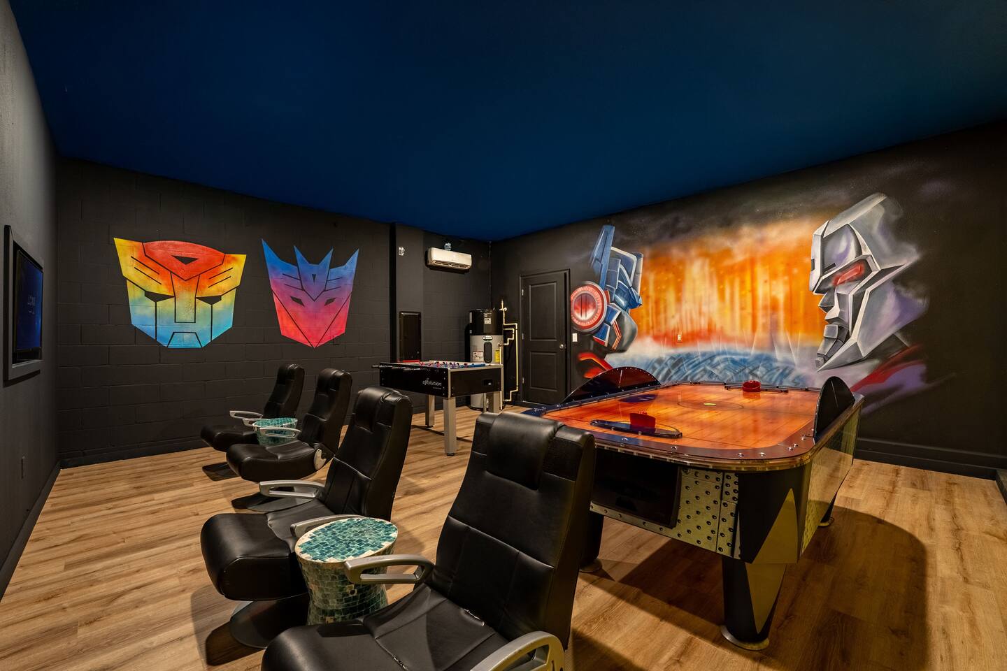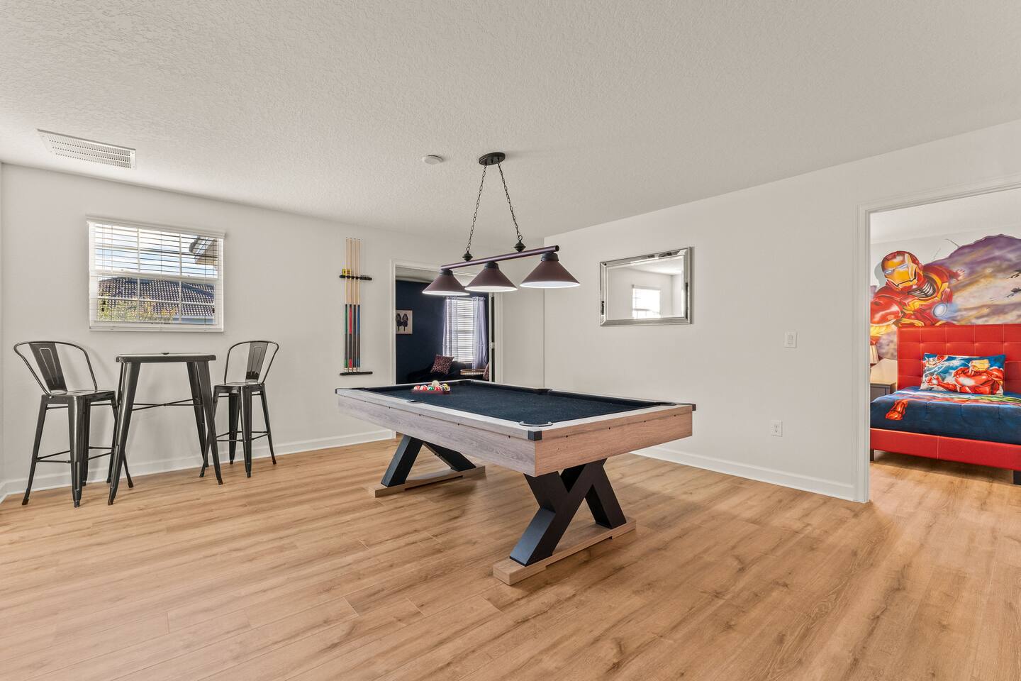 ✨ Prime Location • Approximately 8–12 miles to Walt Disney World Resort (about 15–20 minutes) • Minutes to Universal Studios, SeaWorld, and local dining, shopping & entertainment • Easy access to I-4, Orlando Airport ~30 miles away ☆☆ Bedrooms & Bathrooms ☆☆ This spacious villa comfortably sleeps 18 with 8 bedrooms and 5 full bathrooms. ★ Main Floor Masters ★ Perfect for guests who prefer single-story accommodations: Bedroom 1: Bright, coastal-inspired décor, king-sized bed, wall-mounted Smart TV, and private ensuite bathroom Bedroom 2: Vibrant room with bold orange accents, rustic wood-framed king bed, wall-mounted Smart TV, private ensuite bathroom, and direct access to the pool deck. ★ Second Floor Bedrooms ★ Six additional rooms offering flexibility for families and themed fun: Bedroom 3: Beach-inspired, king-sized bed, arched headboard, soft blue accents, coastal décor, wood flooring. Bedroom 4: Marvel-themed, two twin beds, superhero murals, character bedding, shares a Jack-and-Jill bathroom with Bedroom 5. Bedroom 5: Frozen-themed, two twin-over-twin bunk beds (sleeps 4), vibrant wall murals, character bedding. Bedroom 6: King-sized bed with white statement headboard, plush bedding, sea turtle-themed pillows, deep blue velvet throw, patterned curtains. Bedroom 7: Elegant bedroom with classic black wood arched king bed, spacious and comfortable. Bedroom 8: Bright coastal-themed, king-sized bed, studded headboard, soft blue and white tones with turquoise accents, dual windows, wood flooring. All bedrooms feature comfortable beds, ample storage, and flat-screen TVs. Bathrooms are stocked with plush towels and travel-size essentials. ☆☆ Gourmet Kitchen & Living Spaces ☆☆ The fully equipped kitchen features stainless steel appliances, granite countertops, and everything you need to prepare meals for large groups, from breakfast before the parks to family dinners at night. • Kitchen island seating + formal dining area • Open-concept layout flows into the main living room with a large smart TV! ☆☆ ENTERTAINMENT for All Ages ☆☆ • Converted garage game room featuring air hockey, foosball, two gaming stations with Xbox and PlayStation, pedestal gaming chairs, and bold Transformers-themed wall murals. • Upstairs, you’ll find a game loft with a pool table, cozy seating and TV — a great shared space between the bedrooms for family hangouts and friendly competition. • Plenty of spaces to relax, play games, watch movies, or simply unwind after a full day at the parks. ☆☆ OUTSIDE SPACE ☆☆ Step outside to your private screened-in lanai, featuring: • Heated private pool and spa with safety fencing • Sun loungers, outdoor seating, and dining area, perfect for grilling and relaxing under Florida skies. • A safe and fun outdoor space for kids and adults alike. • Pool heat set at 80 degrees (May–Sept) and 83 degrees (Oct – April) is included in your reservation, higher temperature can be provided for an additional cost. ★☆☆ ChampionsGate Resort Amenities ☆☆★ As guests of this home, you’ll have access to ChampionsGate’s Oasis Clubhouse amenities just walking distance away: ☀ Resort-style pool with lazy river & water slides ☀ Splash pad & children’s play areas ☀ Fitness center ☀ Tiki bar, restaurant, cabanas ☀ Arcade, movie theater, sports courts & more ☀ 24-hour gated security