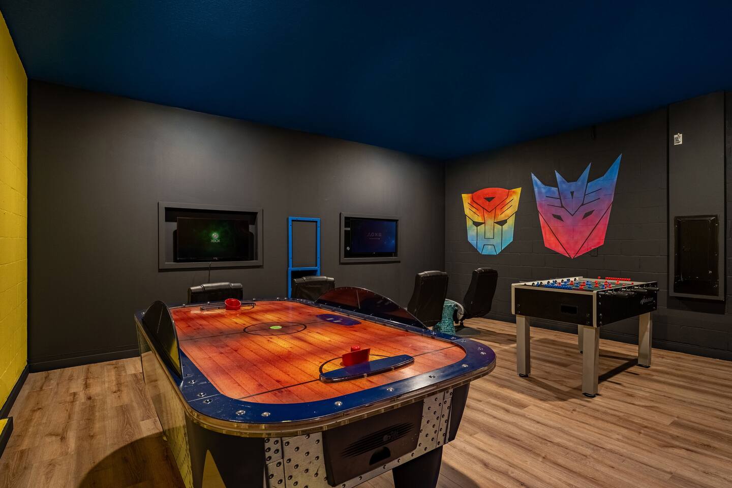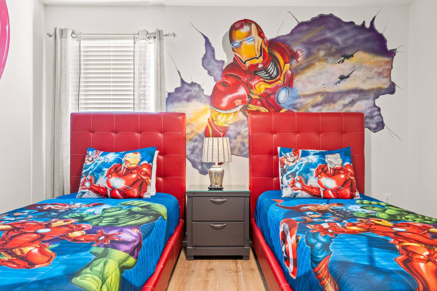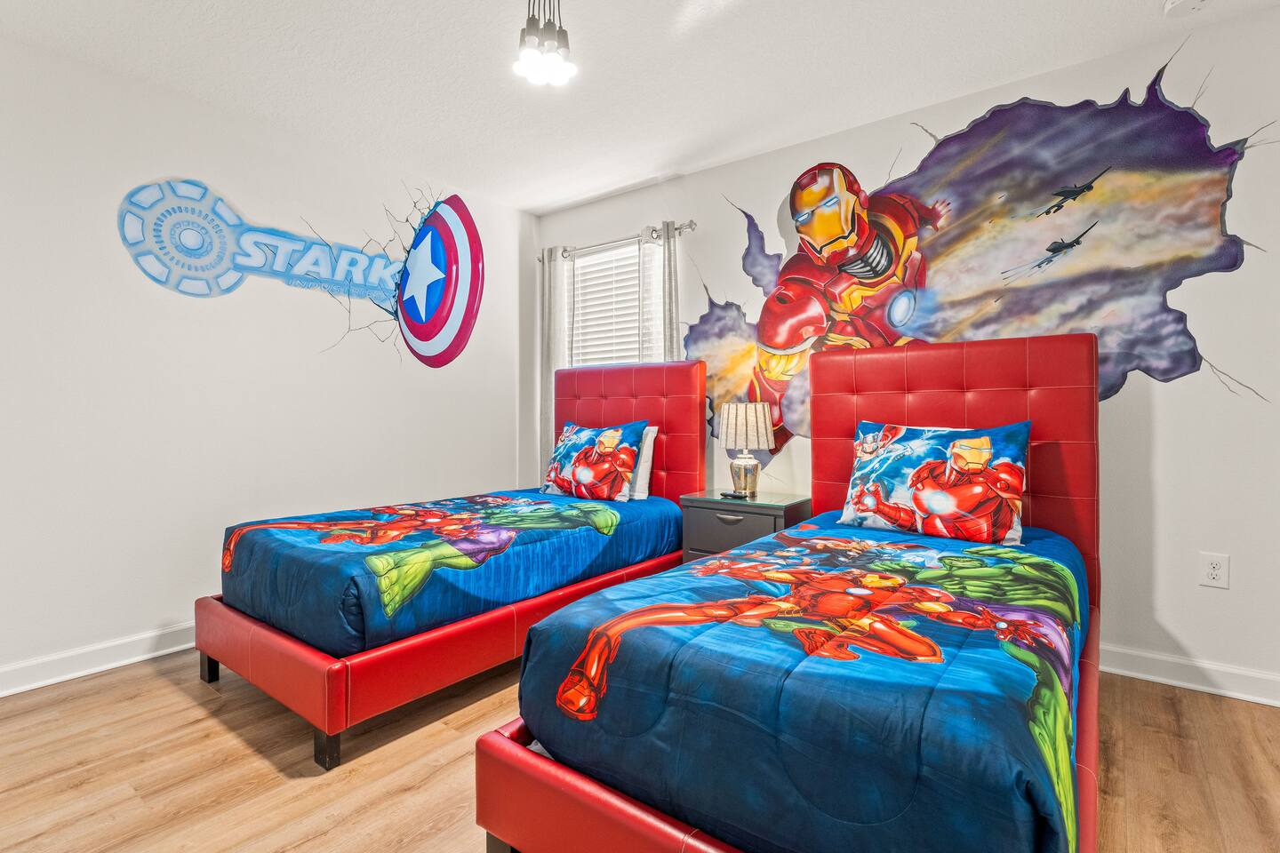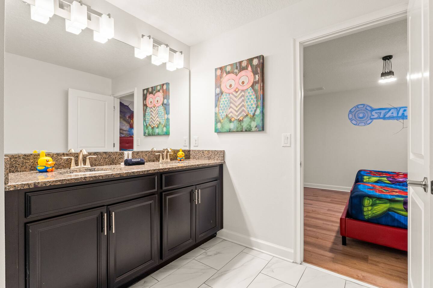 ✨ Prime Location • Approximately 8–12 miles to Walt Disney World Resort (about 15–20 minutes) • Minutes to Universal Studios, SeaWorld, and local dining, shopping & entertainment • Easy access to I-4, Orlando Airport ~30 miles away ☆☆ Bedrooms & Bathrooms ☆☆ This spacious villa comfortably sleeps 18 with 8 bedrooms and 5 full bathrooms. ★ Main Floor Masters ★ Perfect for guests who prefer single-story accommodations: Bedroom 1: Bright, coastal-inspired décor, king-sized bed, wall-mounted Smart TV, and private ensuite bathroom Bedroom 2: Vibrant room with bold orange accents, rustic wood-framed king bed, wall-mounted Smart TV, private ensuite bathroom, and direct access to the pool deck. ★ Second Floor Bedrooms ★ Six additional rooms offering flexibility for families and themed fun: Bedroom 3: Beach-inspired, king-sized bed, arched headboard, soft blue accents, coastal décor, wood flooring. Bedroom 4: Marvel-themed, two twin beds, superhero murals, character bedding, shares a Jack-and-Jill bathroom with Bedroom 5. Bedroom 5: Frozen-themed, two twin-over-twin bunk beds (sleeps 4), vibrant wall murals, character bedding. Bedroom 6: King-sized bed with white statement headboard, plush bedding, sea turtle-themed pillows, deep blue velvet throw, patterned curtains. Bedroom 7: Elegant bedroom with classic black wood arched king bed, spacious and comfortable. Bedroom 8: Bright coastal-themed, king-sized bed, studded headboard, soft blue and white tones with turquoise accents, dual windows, wood flooring. All bedrooms feature comfortable beds, ample storage, and flat-screen TVs. Bathrooms are stocked with plush towels and travel-size essentials. ☆☆ Gourmet Kitchen & Living Spaces ☆☆ The fully equipped kitchen features stainless steel appliances, granite countertops, and everything you need to prepare meals for large groups, from breakfast before the parks to family dinners at night. • Kitchen island seating + formal dining area • Open-concept layout flows into the main living room with a large smart TV! ☆☆ ENTERTAINMENT for All Ages ☆☆ • Converted garage game room featuring air hockey, foosball, two gaming stations with Xbox and PlayStation, pedestal gaming chairs, and bold Transformers-themed wall murals. • Upstairs, you’ll find a game loft with a pool table, cozy seating and TV — a great shared space between the bedrooms for family hangouts and friendly competition. • Plenty of spaces to relax, play games, watch movies, or simply unwind after a full day at the parks. ☆☆ OUTSIDE SPACE ☆☆ Step outside to your private screened-in lanai, featuring: • Heated private pool and spa with safety fencing • Sun loungers, outdoor seating, and dining area, perfect for grilling and relaxing under Florida skies. • A safe and fun outdoor space for kids and adults alike. • Pool heat set at 80 degrees (May–Sept) and 83 degrees (Oct – April) is included in your reservation, higher temperature can be provided for an additional cost. ★☆☆ ChampionsGate Resort Amenities ☆☆★ As guests of this home, you’ll have access to ChampionsGate’s Oasis Clubhouse amenities just walking distance away: ☀ Resort-style pool with lazy river & water slides ☀ Splash pad & children’s play areas ☀ Fitness center ☀ Tiki bar, restaurant, cabanas ☀ Arcade, movie theater, sports courts & more ☀ 24-hour gated security