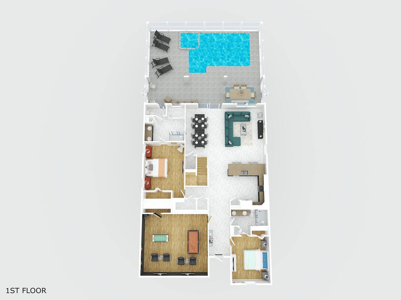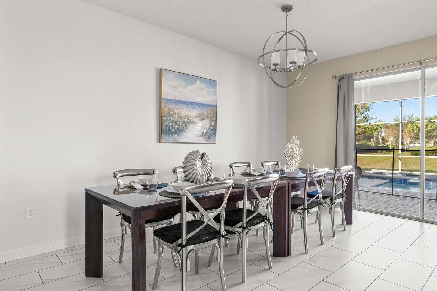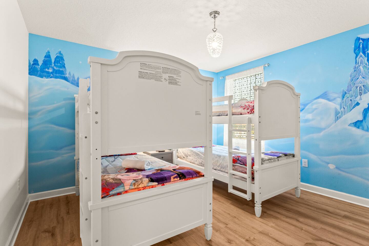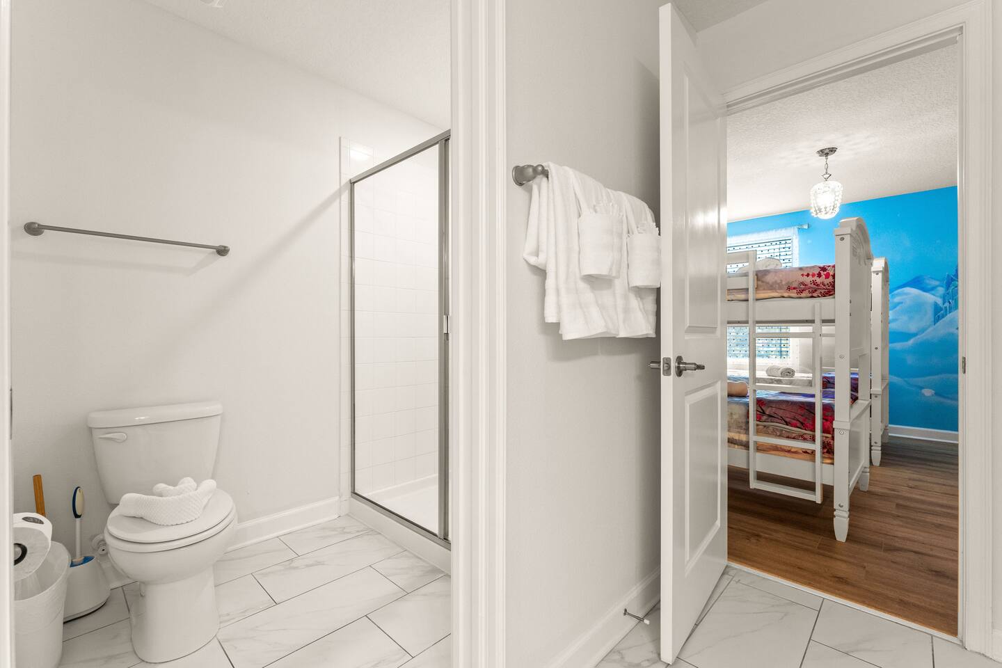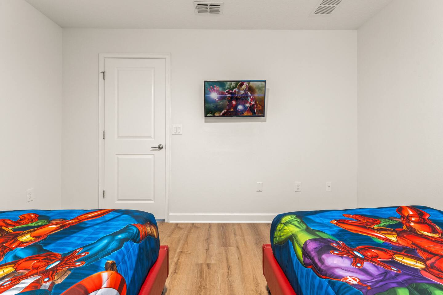 ✨ Prime Location • Approximately 8–12 miles to Walt Disney World Resort (about 15–20 minutes) • Minutes to Universal Studios, SeaWorld, and local dining, shopping & entertainment • Easy access to I-4, Orlando Airport ~30 miles away ☆☆ Bedrooms & Bathrooms ☆☆ This spacious villa comfortably sleeps 18 with 8 bedrooms and 5 full bathrooms. ★ Main Floor Masters ★ Perfect for guests who prefer single-story accommodations: Bedroom 1: Bright, coastal-inspired décor, king-sized bed, wall-mounted Smart TV, and private ensuite bathroom Bedroom 2: Vibrant room with bold orange accents, rustic wood-framed king bed, wall-mounted Smart TV, private ensuite bathroom, and direct access to the pool deck. ★ Second Floor Bedrooms ★ Six additional rooms offering flexibility for families and themed fun: Bedroom 3: Beach-inspired, king-sized bed, arched headboard, soft blue accents, coastal décor, wood flooring. Bedroom 4: Marvel-themed, two twin beds, superhero murals, character bedding, shares a Jack-and-Jill bathroom with Bedroom 5. Bedroom 5: Frozen-themed, two twin-over-twin bunk beds (sleeps 4), vibrant wall murals, character bedding. Bedroom 6: King-sized bed with white statement headboard, plush bedding, sea turtle-themed pillows, deep blue velvet throw, patterned curtains. Bedroom 7: Elegant bedroom with classic black wood arched king bed, spacious and comfortable. Bedroom 8: Bright coastal-themed, king-sized bed, studded headboard, soft blue and white tones with turquoise accents, dual windows, wood flooring. All bedrooms feature comfortable beds, ample storage, and flat-screen TVs. Bathrooms are stocked with plush towels and travel-size essentials. ☆☆ Gourmet Kitchen & Living Spaces ☆☆ The fully equipped kitchen features stainless steel appliances, granite countertops, and everything you need to prepare meals for large groups, from breakfast before the parks to family dinners at night. • Kitchen island seating + formal dining area • Open-concept layout flows into the main living room with a large smart TV! ☆☆ ENTERTAINMENT for All Ages ☆☆ • Converted garage game room featuring air hockey, foosball, two gaming stations with Xbox and PlayStation, pedestal gaming chairs, and bold Transformers-themed wall murals. • Upstairs, you’ll find a game loft with a pool table, cozy seating and TV — a great shared space between the bedrooms for family hangouts and friendly competition. • Plenty of spaces to relax, play games, watch movies, or simply unwind after a full day at the parks. ☆☆ OUTSIDE SPACE ☆☆ Step outside to your private screened-in lanai, featuring: • Heated private pool and spa with safety fencing • Sun loungers, outdoor seating, and dining area, perfect for grilling and relaxing under Florida skies. • A safe and fun outdoor space for kids and adults alike. • Pool heat set at 80 degrees (May–Sept) and 83 degrees (Oct – April) is included in your reservation, higher temperature can be provided for an additional cost. ★☆☆ ChampionsGate Resort Amenities ☆☆★ As guests of this home, you’ll have access to ChampionsGate’s Oasis Clubhouse amenities just walking distance away: ☀ Resort-style pool with lazy river & water slides ☀ Splash pad & children’s play areas ☀ Fitness center ☀ Tiki bar, restaurant, cabanas ☀ Arcade, movie theater, sports courts & more ☀ 24-hour gated security
