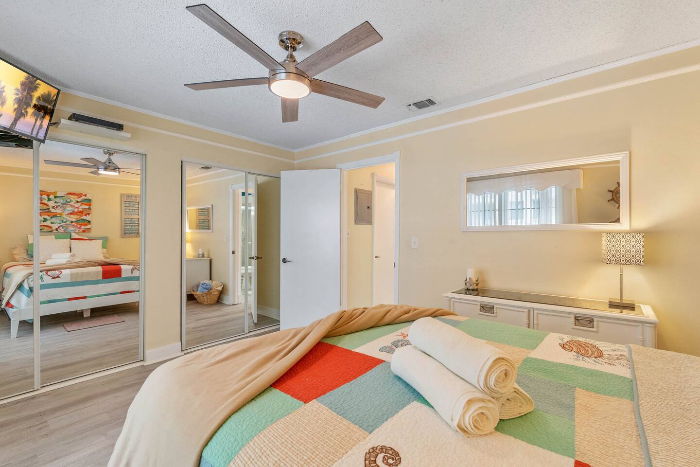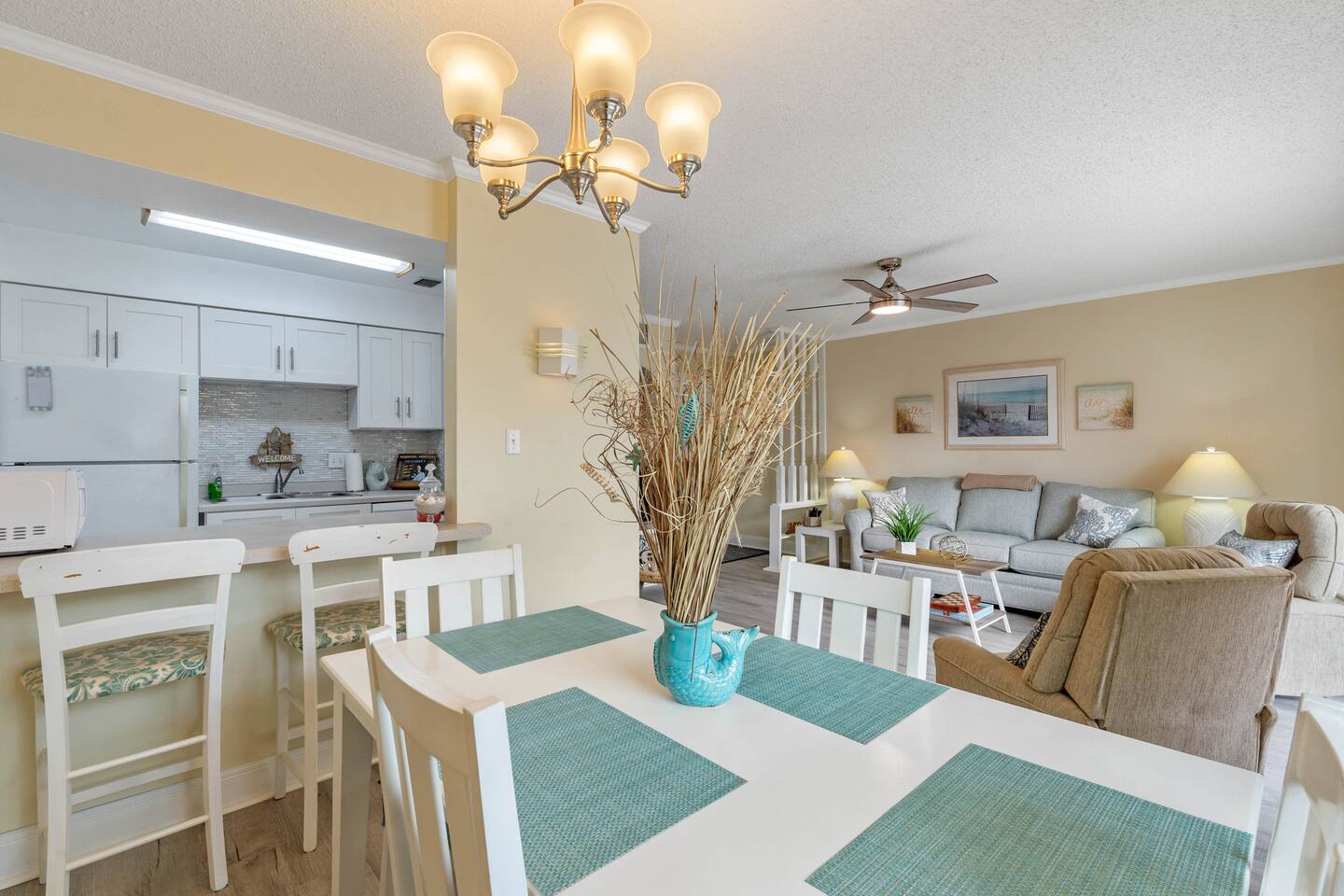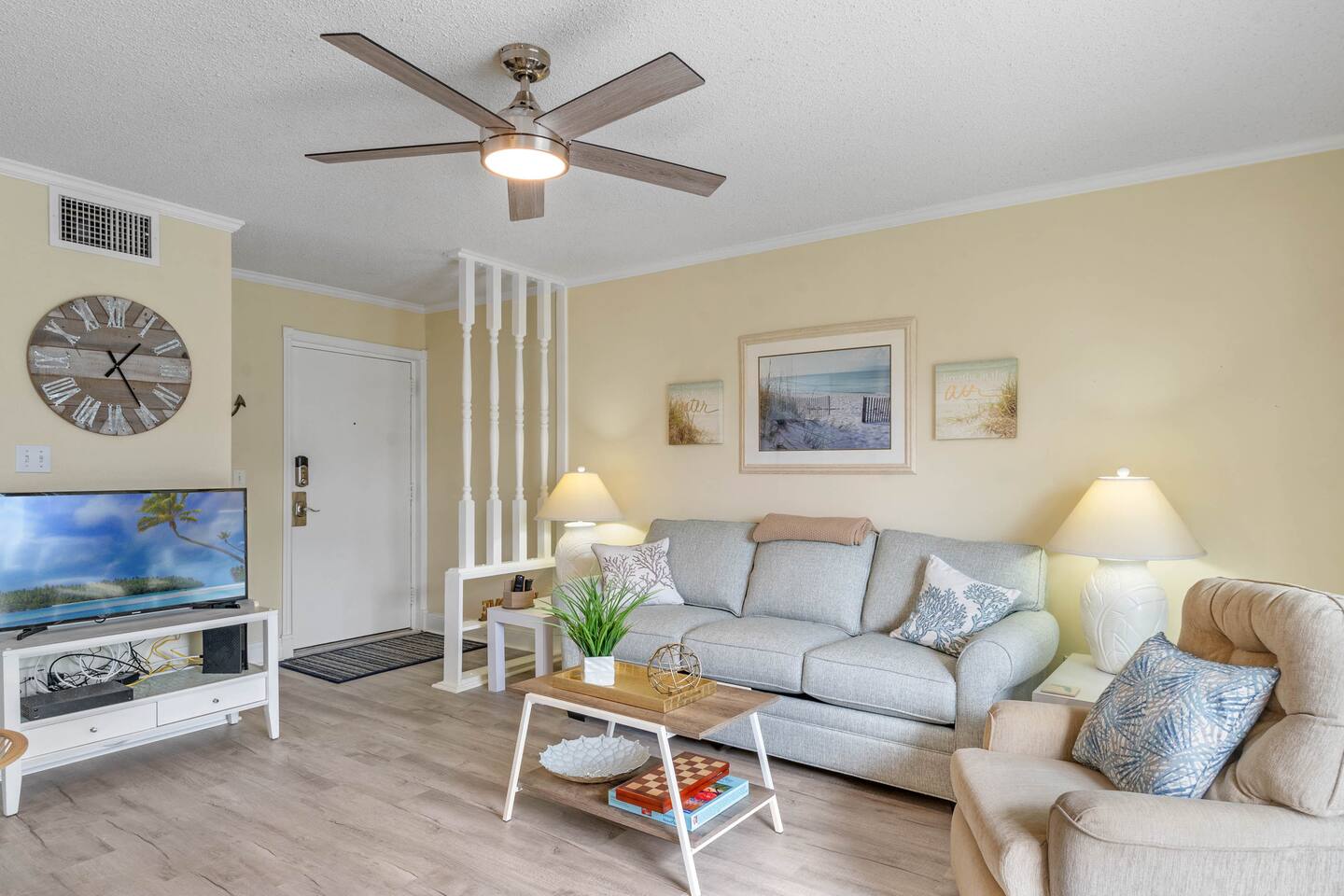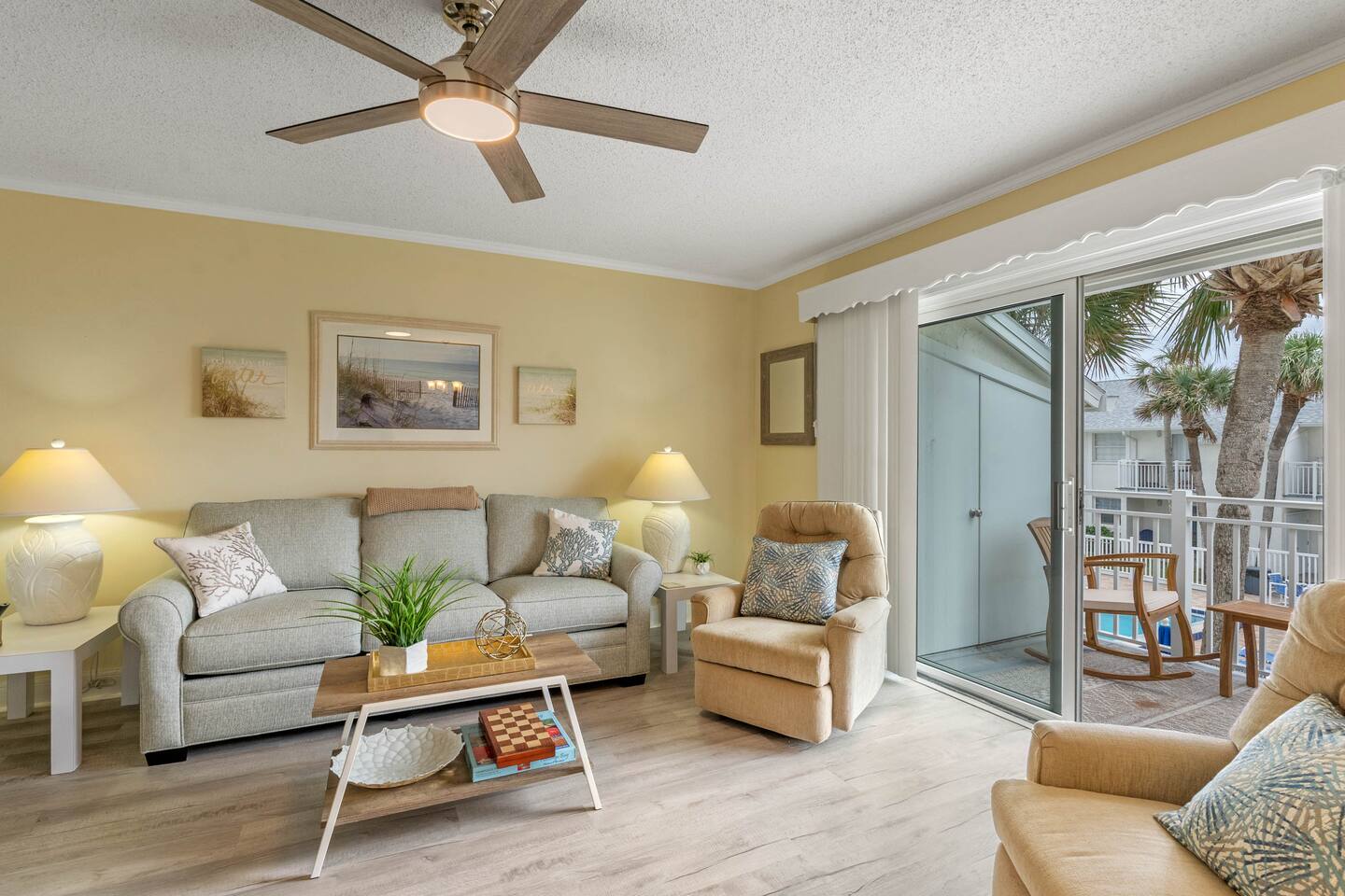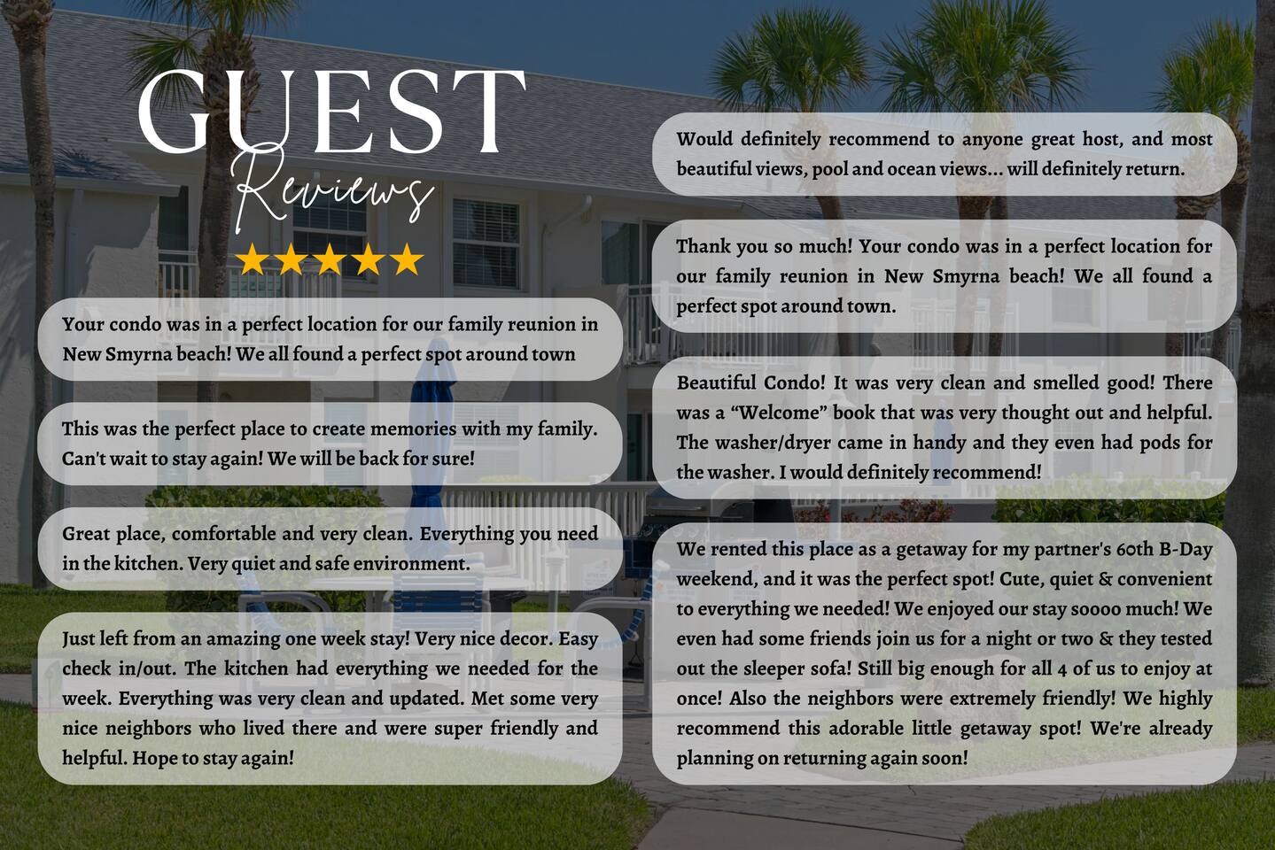 Guests will have full access to the condo. Free parking is available onsite for one vehicle (carport market 208). For those traveling with little ones, we offer Pack n’ Plays and a highchair at an additional cost. ***All items must be requested 14 days prior to your arrival. We are an accessible property: ☀ Wide hallways, spacious common areas ☀ Walk-in master shower with laundry facilities ☀ Access to private balcony ☀ Various amenities like 2 pools, shuffleboard court and direct beach access We provide a small starter pack with basics like: ☀ 1 Paper Towel ☀ 1 Dish Sponge ☀ 1 Dish Detergent ☀ 2 Extra Trash Bags ☀ 2 Toilet Paper Roll Per Bath ☀ 2 to 3 Dishwashing Capsules in The Kitchen ☀ Small soap and small shampoo/conditioner per bathroom Please stop by the nearest Supermarket to gather any additional items you may need for the duration of your stay. The kitchen is well stocked with amenities we enjoy for large groups: ☀ Ample Serving Bowls ☀ Basic baking ware ☀ Keurig Coffee Maker ☀ Dishes & utensils for a crowd ☀ Pots & Pans to include a large Stock Pot ☀ Blender & Pitchers for serving Margaritas ☀ Oven ☀ Toaster ☀ Dishwasher ☀ Microwave HOUSEKEEPING: There is no daily housekeeping service provided at the rental rate. Before check-in, the unit will be thoroughly cleaned and inspected by a professional cleaning company. Clean sheets and towels will be available in the unit. Mid-stay cleaning services during your stay can be requested for an additional fee. FOOD: As per Florida law, we are not allowed to leave open food in the refrigerators or kitchen closets, hence, all food items will be removed after the guest checks out, and no supply of items such as condiments will be provided prior to check-in. Other things to note Check-in is at 4:00 pm and check-out is at 10:00 am. We do offer either early check-in or late check-out, or both! However, please note this option is only available if we don't have same-day check-in as we require enough time between reservations to clean the home to our professional standards. Please send the requests well in advance so that we can coordinate in advance with our cleaning crew. Early Check-In: $50 add-on (3:00 pm instead) $75 add-on (2:00 pm instead) Late Check-Out: $100 add-on (11:00 am instead) $150 add-on (12:00 pm instead) In compliance with different local ordinances and our insurance provider, you might be asked to sign a rental agreement prior to check-in. This agreement ensures transparency and protects both parties. We do not accept bookings from guests rated below 4 stars. Guests with ratings between 4 and 4.5 stars will require approval from management. Please remember that you're staying in someone's home, not a hotel. Please treat the space with respect. If any problems arise, we will do our best to act immediately; however, please keep in mind there is no one living on site 24/7. If you have an issue with the home, please let us know so we can fix it immediately!