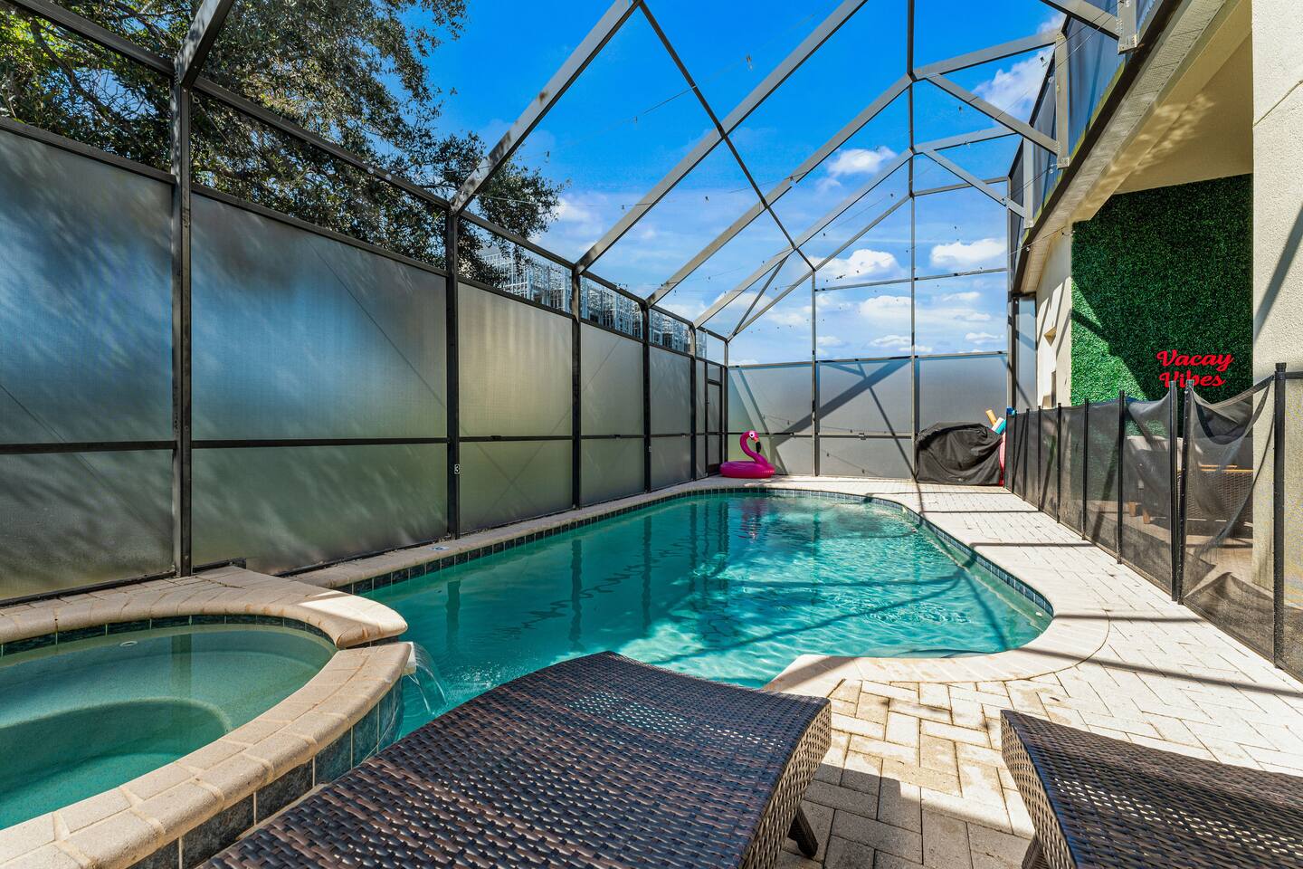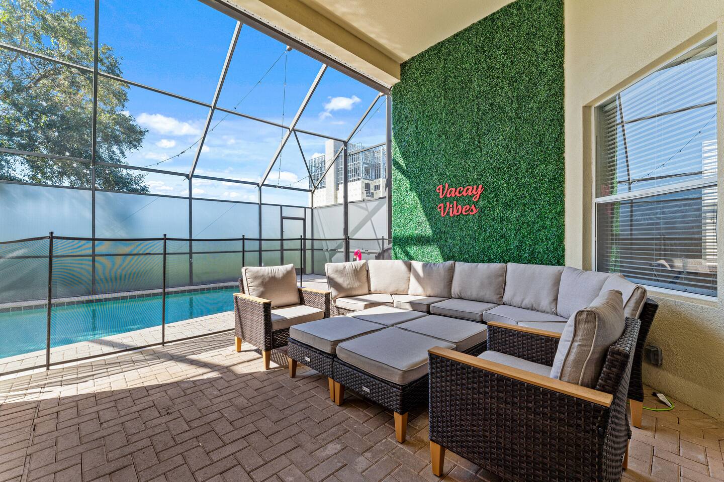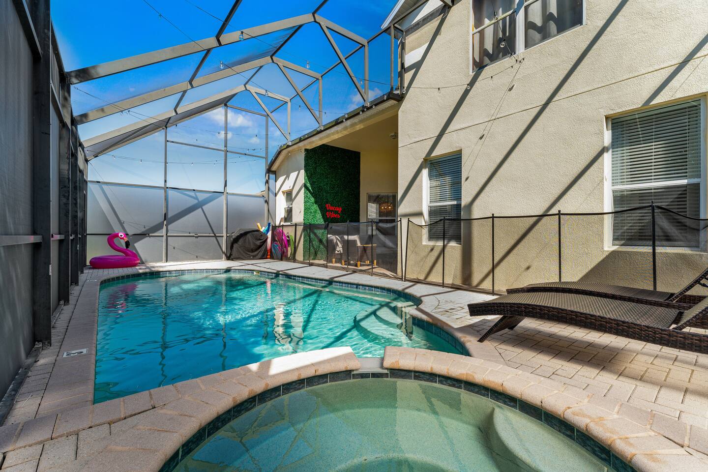 Guests will have full access to the whole home. Free parking is available onsite for two vehicles in the driveway. A maximum of 3 cars are allowed in the community. For those traveling with little ones, we offer Pack n’ Plays, a highchair, and a tension stair gate, at no additional cost. **All items must be requested 14 days prior to your arrival. Just so you know, a baseline set of Pool Heat - set to 80 degrees in the summer (May-Sep), and 83 degrees in the winter (Sep-Apr) is included in your reservation. The Heat Pump Runs from (8 AM – 7 PM). During the winter, to constantly maintain a more moderate pool temperature, it requires a higher temperature (typically 88 degrees) and the pump is usually required to run 24 HRS a day during your stay. If this sounds like a better option for you, we can provide this service at an additional cost of $35 / Day. Please let our team know at least 48 HRS in advance, as it can take that amount of time to heat the pool with cooler outdoor temperatures. We provide a small starter pack with basics like: ☀ 1 Paper Towel ☀ 1 Dish Sponge ☀ 1 Dish Detergent ☀ 2 Extra Trash Bags ☀ 2 Toilet Paper Roll Per Bath ☀ 2 to 3 Dishwashing Capsules in The Kitchen ☀ Small soap and small shampoo/conditioner per bathroom Please stop by the nearest Supermarket to gather any additional items you may need for the duration of your stay. The kitchen is well stocked with amenities we enjoy for large groups: ☀ Ample Serving Bowls ☀ Keurig Coffee Maker ☀ Basic baking ware ☀ Dishes & utensils for a crowd ☀ Pots & Pans to include a large Stock Pot ☀ Blender & Pitchers for serving Margaritas ☀ Microwave ☀ Oven ☀ Toaster ☀ Dishwasher HOUSEKEEPING: There is no daily housekeeping service provided at the rental rate. Before check-in, the unit will be thoroughly cleaned and inspected by a professional cleaning company. Clean sheets and towels will be available in the unit. Mid-stay cleaning services during your stay can be requested for an additional fee. GRILL 🔥: Enjoy the grill during your stay! Most homes in the area charge extra, but we include it for you! Guests are kindly asked to provide their own propane for the grill. Occasionally, previous guests may leave some behind, so you may be able to use it, but as a general rule, guests should plan to bring or swap propane at a local exchange station. FOOD: As per Florida law, we are not allowed to leave open food in the refrigerators or kitchen closets, hence, all food items will be removed after the guest checks out, and no supply of items such as condiments will be provided prior to check-in. Other things to note: Check-in is at 4:00 pm and check-out is at 10:00 am. We do offer either early check-in or late check-out, or both! However, please note this option is only available if we don't have same-day check-in as we require enough time between reservations to clean the home to our professional standards. Please send the requests well in advance so that we can coordinate in advance with our cleaning crew. Early Check-In: $50 add-on (3:00 pm instead) $75 add-on (2:00 pm instead) Late Check-Out: $100 add-on (11:00 am instead) $150 add-on (12:00 pm instead) In accordance with local regulations and the requirements of our insurance provider, guests may be asked to sign a rental agreement prior to check-in. This agreement is intended to ensure transparency and provide protection for both parties. We do not accept bookings from guests rated below 4 stars. Guests with ratings between 4 and 4.5 stars will require approval from management. Please remember that you're staying in someone's home, not a hotel. Please treat the space with respect. If any problems arise, we will do our best to act immediately; however, please keep in mind there is no one living on site 24/7. If you have an issue with the home, please let us know so we can fix it immediately!