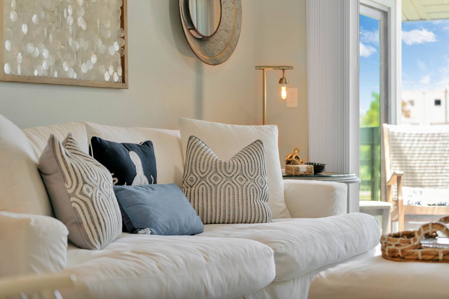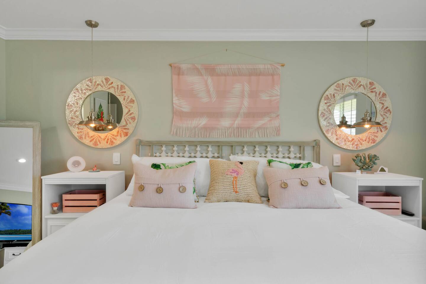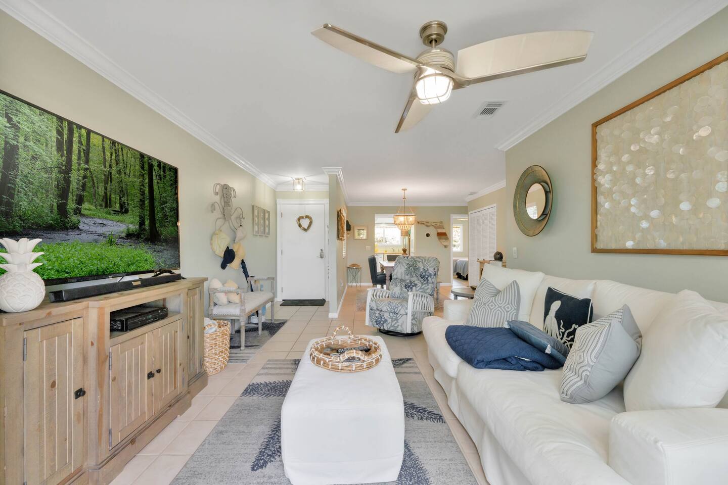 Features: 2BR/2BA 2 Smart TVs Keyless entry High-Speed Wi-Fi + Dedicated Workspace Heated Pool Bedroom: Spacious master bedroom with a king-size bed with access to the balcony, a TV, and an attached bathroom 2nd bedroom has 2 twin beds Master walk-in closet Fully Equipped Kitchen: Refrigerator, freezer, microwave, oven, dishwasher, coffee maker, Dishes and silverware Baking sheets Dishwasher Cooking basics: pots, pans, oil, salt, pepper, etc. Dining: Table seats 6 people with 4 elegant dining chairs Entertainment: Smart TV in the master bedroom The main living room has a SMART TV Outdoor Living Space: Public Outdoor picnic area Public/Shared beach access 3 shared outdoor pools (1 is heated year-round) Beach essentials Private balcony Shared sauna Steps from the beach