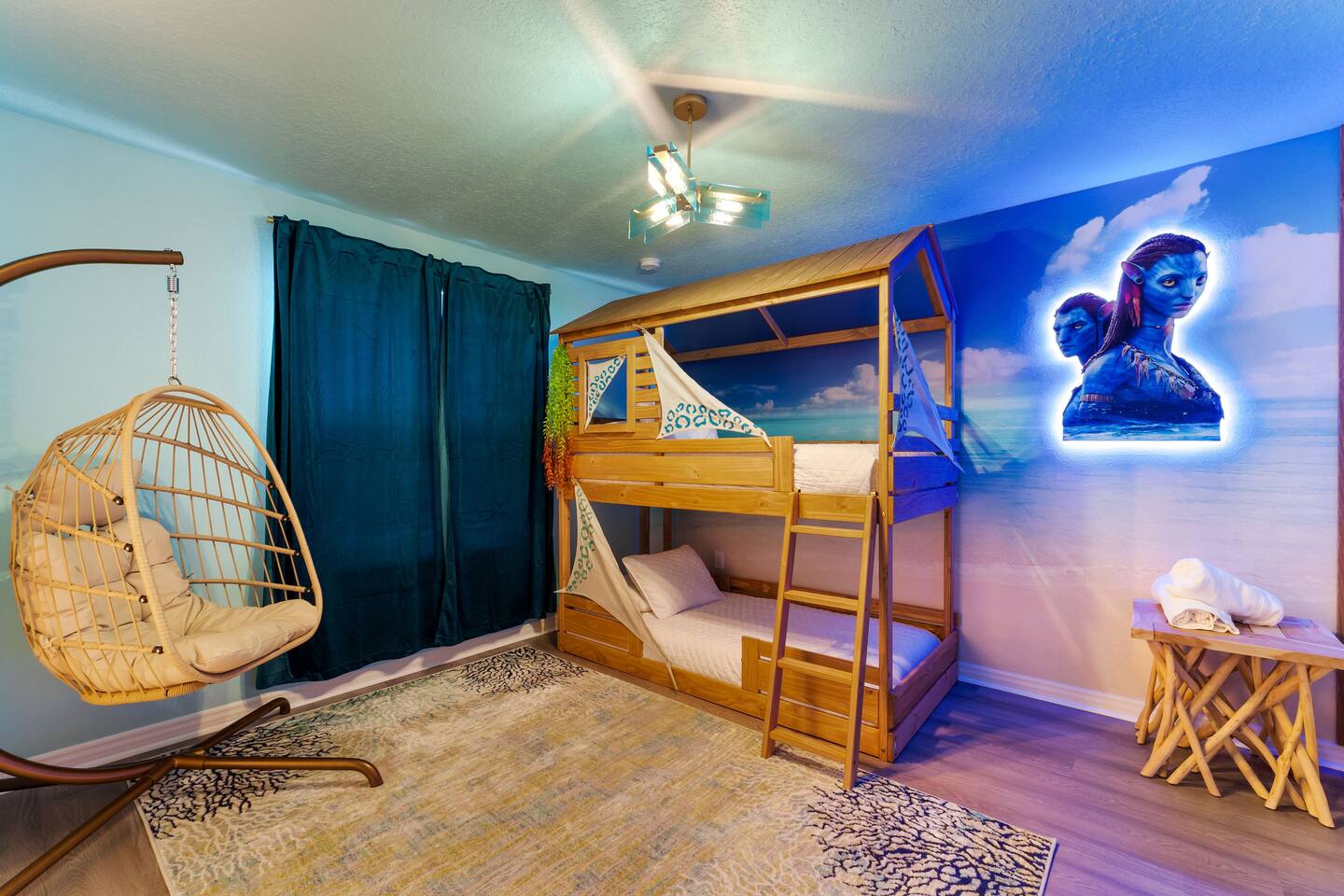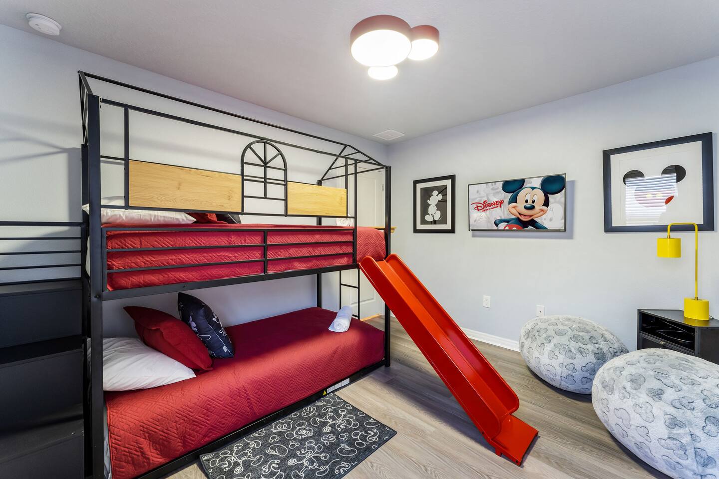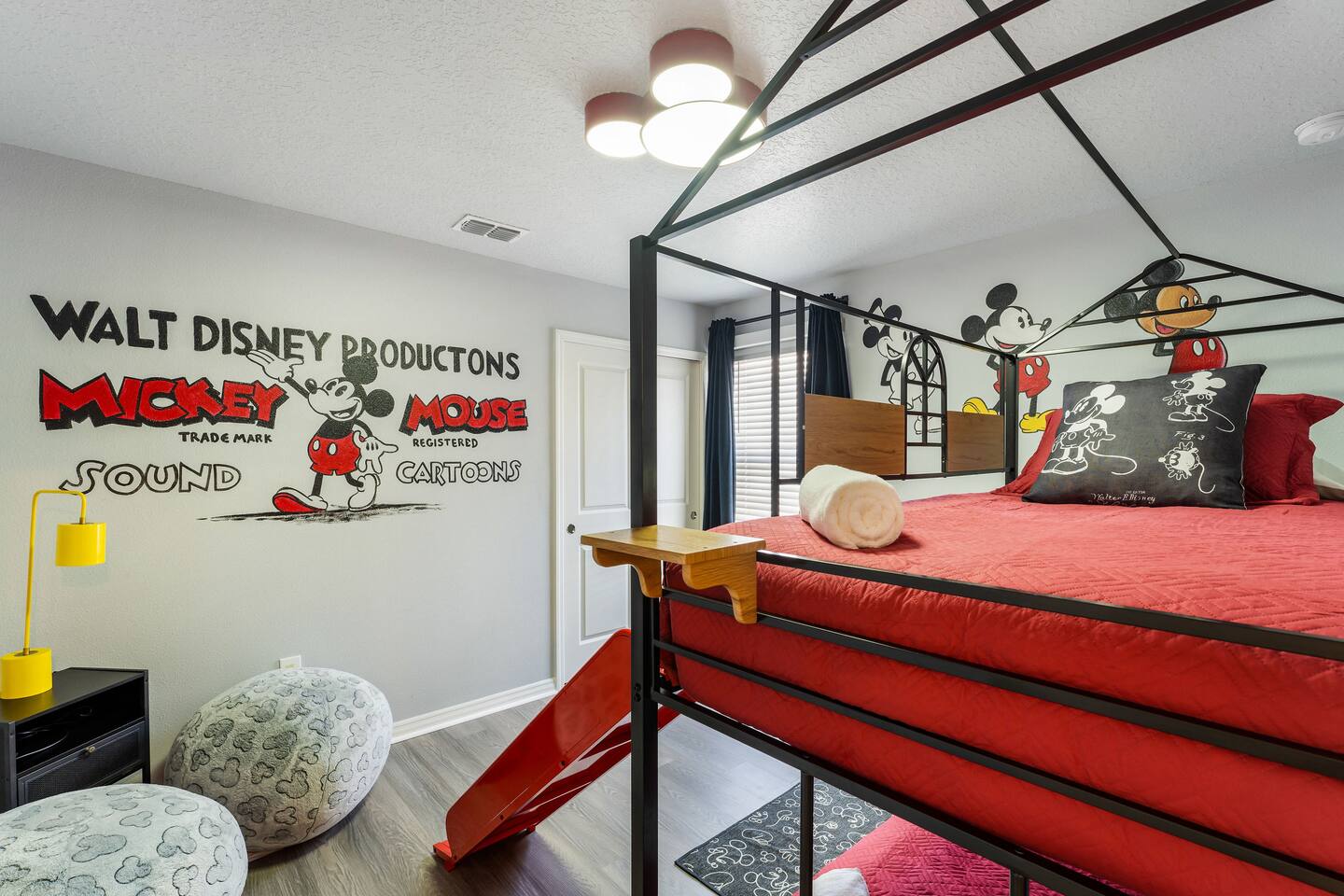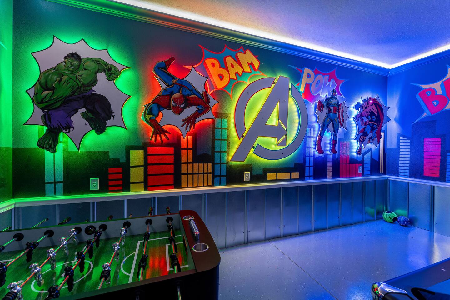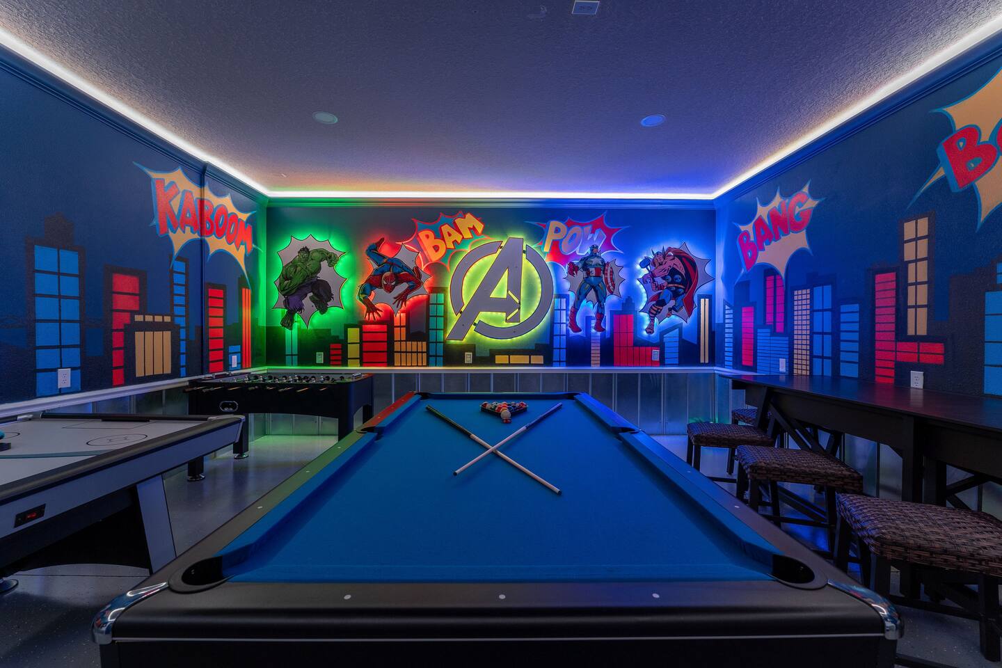 KEY FEATURES: ☀ 8 bedrooms – Themed Luxury Design! SLEEPS 17 ☀ Large family room; flat-screen smart TVs / GAME CONSOLES ☀ SUPER FAST high-speed internet ☀ Fully themed / Airconditioned Game Room ☀ 2 suites on the first floor ☀ Onsite washer + dryer ☀ Luxury gated community; Windsor Island ☀ Private Outdoor Lounge w / Bar; Pool + Spa with FREE pool HEAT (80°) ☀ Fully equipped kitchen; large dining area ☀ Fully accessible first floor ☀ Dedicated Workstation ☀ Free secured parking ☀ Full access to resort amenities; 140,000-gallon resort-style pool, water park, splash pad, arcade, fitness center, sports complex, marketplace, mini golf + more ☀ Complimentary children’s amenities; Pack n’ Play, highchair + more (**Must be requested 14 days before arrival**) ☆☆ BEDROOMS + BATHROOMS ☆☆ Guests of all ages are guaranteed to find the perfect bedroom in this spacious home. There are two bedrooms on the first floor, all are wheelchair accessible. The other 6 bedrooms are on the second floor along with a large loft. The first main-level bedroom features a king-sized bed, a flat-screen SMART TV, and a unique THRONE ROOM! This bedroom has an attached ensuite bathroom that leads out to the pool. The second main-level bedroom features a queen bed, a designated workstation, and a flat-screen SMART TV. The second story features a large loft with a game console and two TV's. There are 6 FULLY THEMED Bedrooms, all featuring SMART TVS and many unique additional amenities! All bathrooms are stocked with toilet paper, travel-sized soap, shampoo, conditioner, and plush towels. Please remember to stop at the supermarket to buy any other supplies you may need for your stay. ☆☆ KITCHEN ☆☆ • Fully-Equipped Kitchen: • Updated appliances • Ample counter space • Essential cooking utensils, blender, griddle + more • Coffee & Tea Station: • Keurig coffee maker • Electric Tea Kettle • Drip coffee maker • Island Seating for 4 • Outdoor Lounge Area and Bar • Formal dining table seating for 12 • Kitchen Starter Pack: paper towel, sponge, dish detergent ☆☆ LIVING ROOM ☆☆ Step into our inviting living room, a perfect blend of comfort and entertainment. It features a large Smart TV for your viewing pleasure, a large kitchen, and an Island perfect for entertaining guests! ☆☆ GARAGE / GAMEROOM ☆☆ The garage has been converted into an Avengers game room that the whole family is sure to love. Enjoy a vacation tournament of billiards, air hockey, or foosball. ☆☆ OUTSIDE SPACE ☆☆ Step outside onto the private patio and enjoy the lush surroundings. The screened-in south-facing patio is the perfect place to hang out after a long day at the parks. This luxurious area features a private pool and hot tub with a safety net for the kiddos and sun loungers for everyone to enjoy. Enjoy a night swim with our color-changing pool light! Pool heat set at 80 degrees (May–Sept) and 83 degrees (Oct – April) is included in your reservation, higher temperature can be provided for an additional cost. ★☆ Book Today & Let Us Take Care of You in Central Florida! ☆★