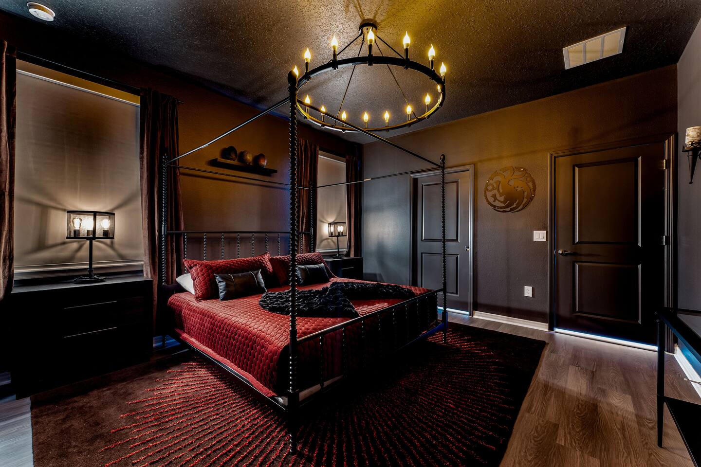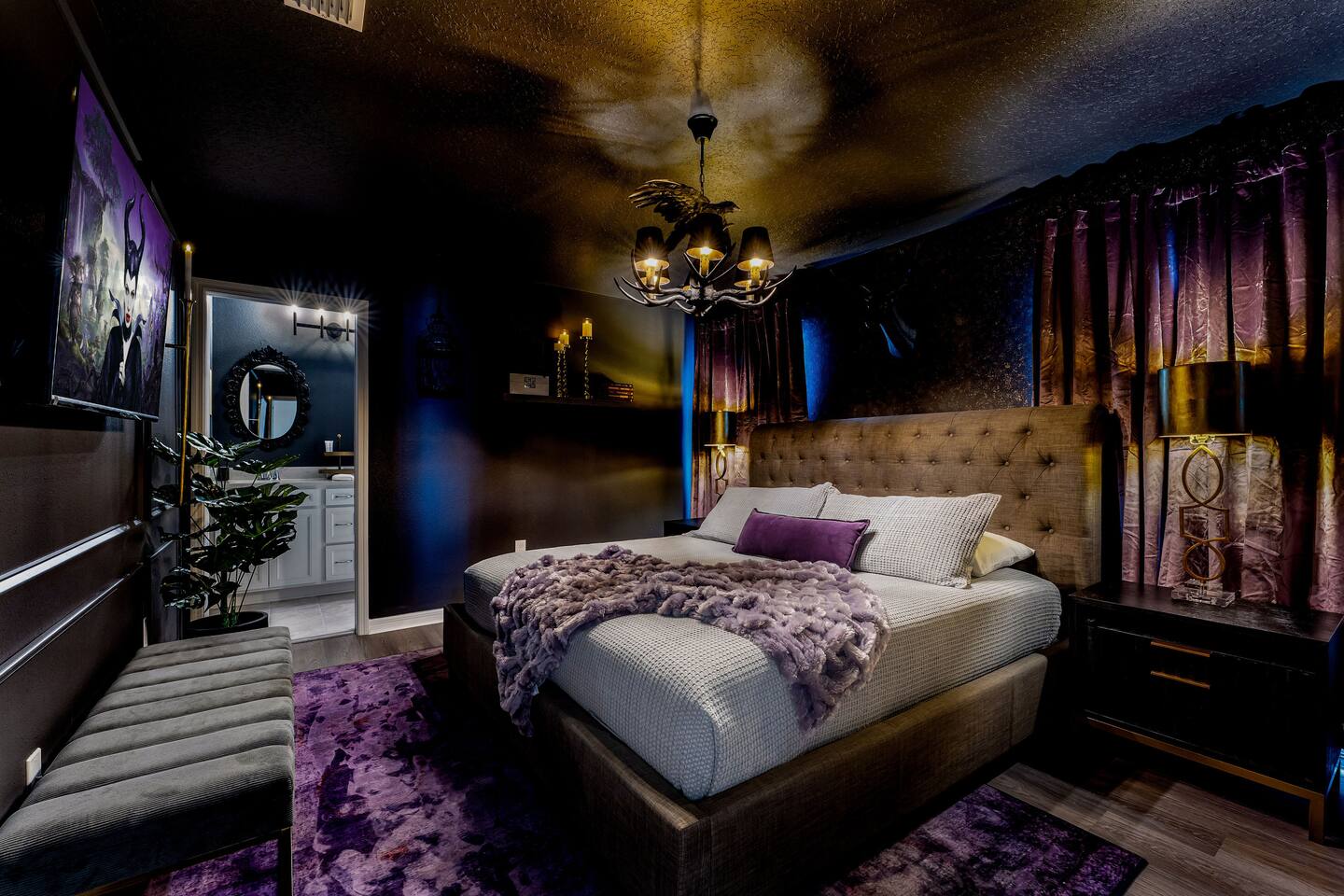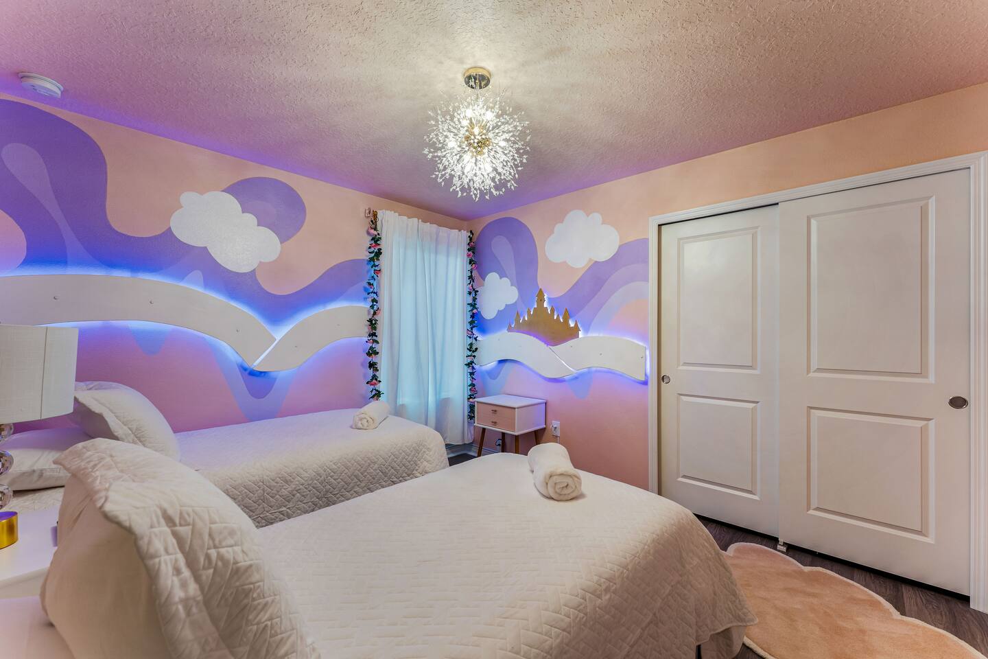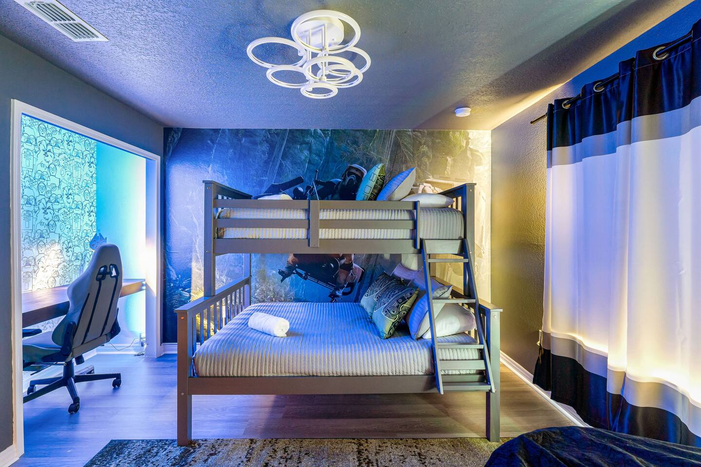 KEY FEATURES: ☀ 8 bedrooms – Themed Luxury Design! SLEEPS 17 ☀ Large family room; flat-screen smart TVs / GAME CONSOLES ☀ SUPER FAST high-speed internet ☀ Fully themed / Airconditioned Game Room ☀ 2 suites on the first floor ☀ Onsite washer + dryer ☀ Luxury gated community; Windsor Island ☀ Private Outdoor Lounge w / Bar; Pool + Spa with FREE pool HEAT (80°) ☀ Fully equipped kitchen; large dining area ☀ Fully accessible first floor ☀ Dedicated Workstation ☀ Free secured parking ☀ Full access to resort amenities; 140,000-gallon resort-style pool, water park, splash pad, arcade, fitness center, sports complex, marketplace, mini golf + more ☀ Complimentary children’s amenities; Pack n’ Play, highchair + more (**Must be requested 14 days before arrival**) ☆☆ BEDROOMS + BATHROOMS ☆☆ Guests of all ages are guaranteed to find the perfect bedroom in this spacious home. There are two bedrooms on the first floor, all are wheelchair accessible. The other 6 bedrooms are on the second floor along with a large loft. The first main-level bedroom features a king-sized bed, a flat-screen SMART TV, and a unique THRONE ROOM! This bedroom has an attached ensuite bathroom that leads out to the pool. The second main-level bedroom features a queen bed, a designated workstation, and a flat-screen SMART TV. The second story features a large loft with a game console and two TV's. There are 6 FULLY THEMED Bedrooms, all featuring SMART TVS and many unique additional amenities! All bathrooms are stocked with toilet paper, travel-sized soap, shampoo, conditioner, and plush towels. Please remember to stop at the supermarket to buy any other supplies you may need for your stay. ☆☆ KITCHEN ☆☆ • Fully-Equipped Kitchen: • Updated appliances • Ample counter space • Essential cooking utensils, blender, griddle + more • Coffee & Tea Station: • Keurig coffee maker • Electric Tea Kettle • Drip coffee maker • Island Seating for 4 • Outdoor Lounge Area and Bar • Formal dining table seating for 12 • Kitchen Starter Pack: paper towel, sponge, dish detergent ☆☆ LIVING ROOM ☆☆ Step into our inviting living room, a perfect blend of comfort and entertainment. It features a large Smart TV for your viewing pleasure, a large kitchen, and an Island perfect for entertaining guests! ☆☆ GARAGE / GAMEROOM ☆☆ The garage has been converted into an Avengers game room that the whole family is sure to love. Enjoy a vacation tournament of billiards, air hockey, or foosball. ☆☆ OUTSIDE SPACE ☆☆ Step outside onto the private patio and enjoy the lush surroundings. The screened-in south-facing patio is the perfect place to hang out after a long day at the parks. This luxurious area features a private pool and hot tub with a safety net for the kiddos and sun loungers for everyone to enjoy. Enjoy a night swim with our color-changing pool light! Pool heat set at 80 degrees (May–Sept) and 83 degrees (Oct – April) is included in your reservation, higher temperature can be provided for an additional cost. ★☆ Book Today & Let Us Take Care of You in Central Florida! ☆★
