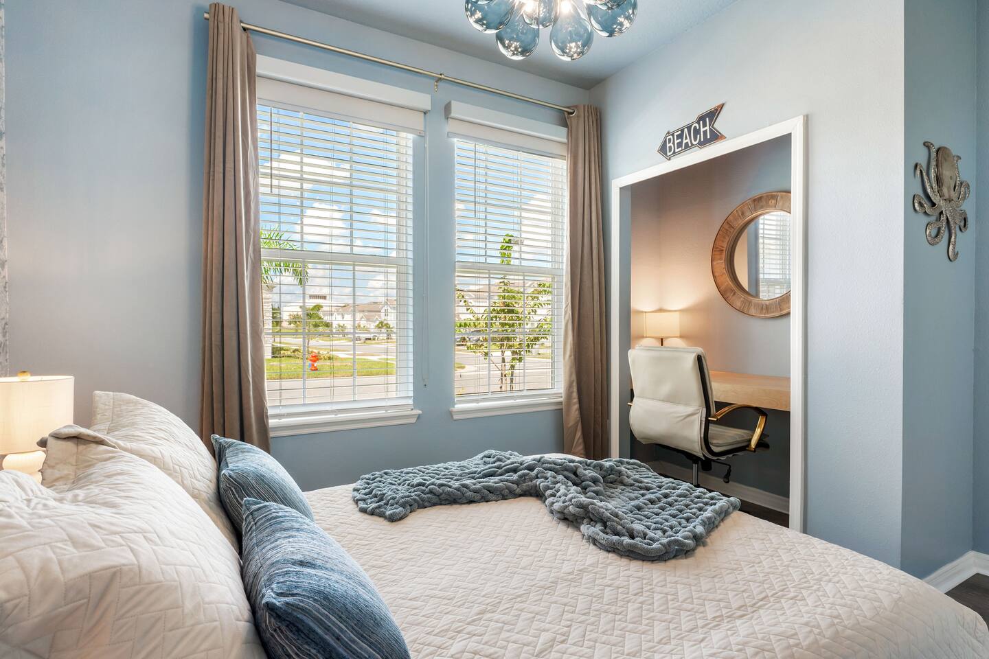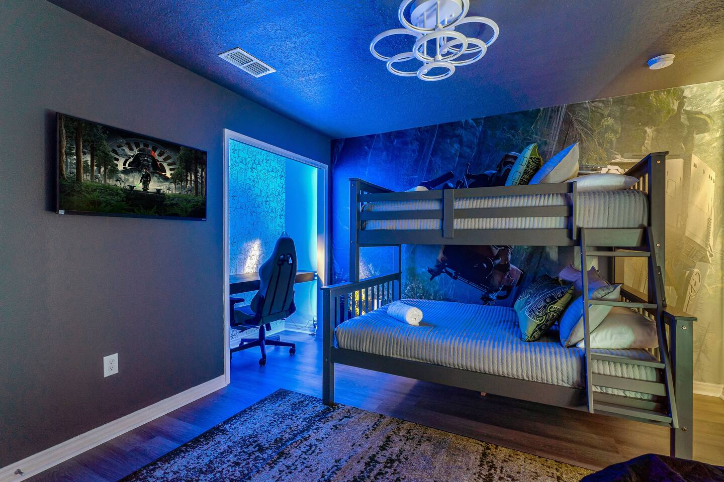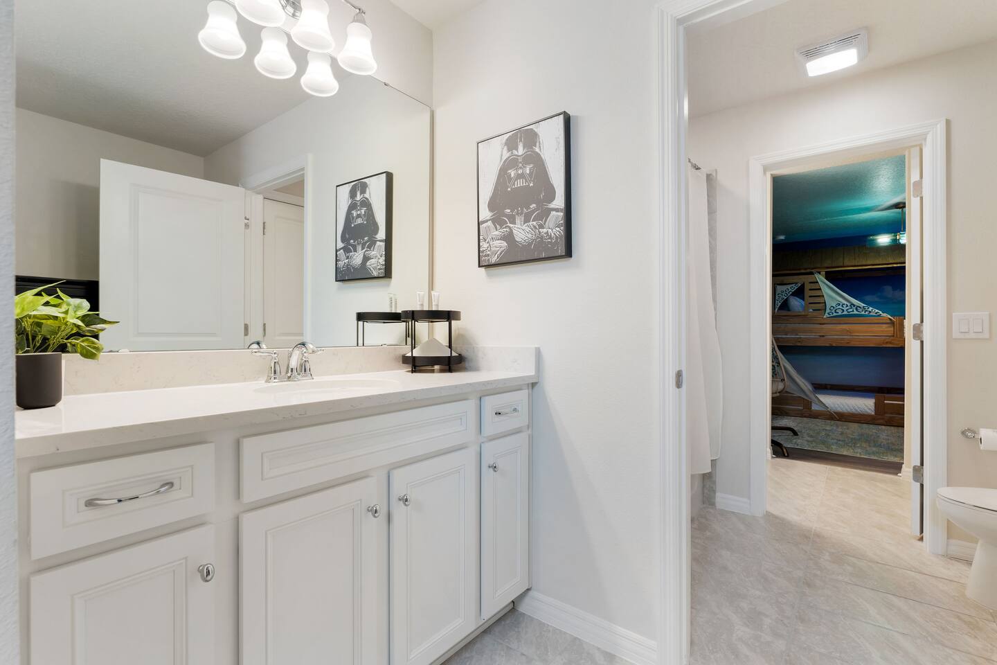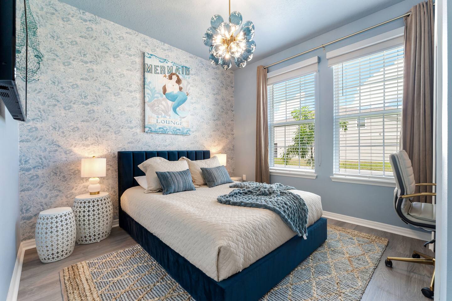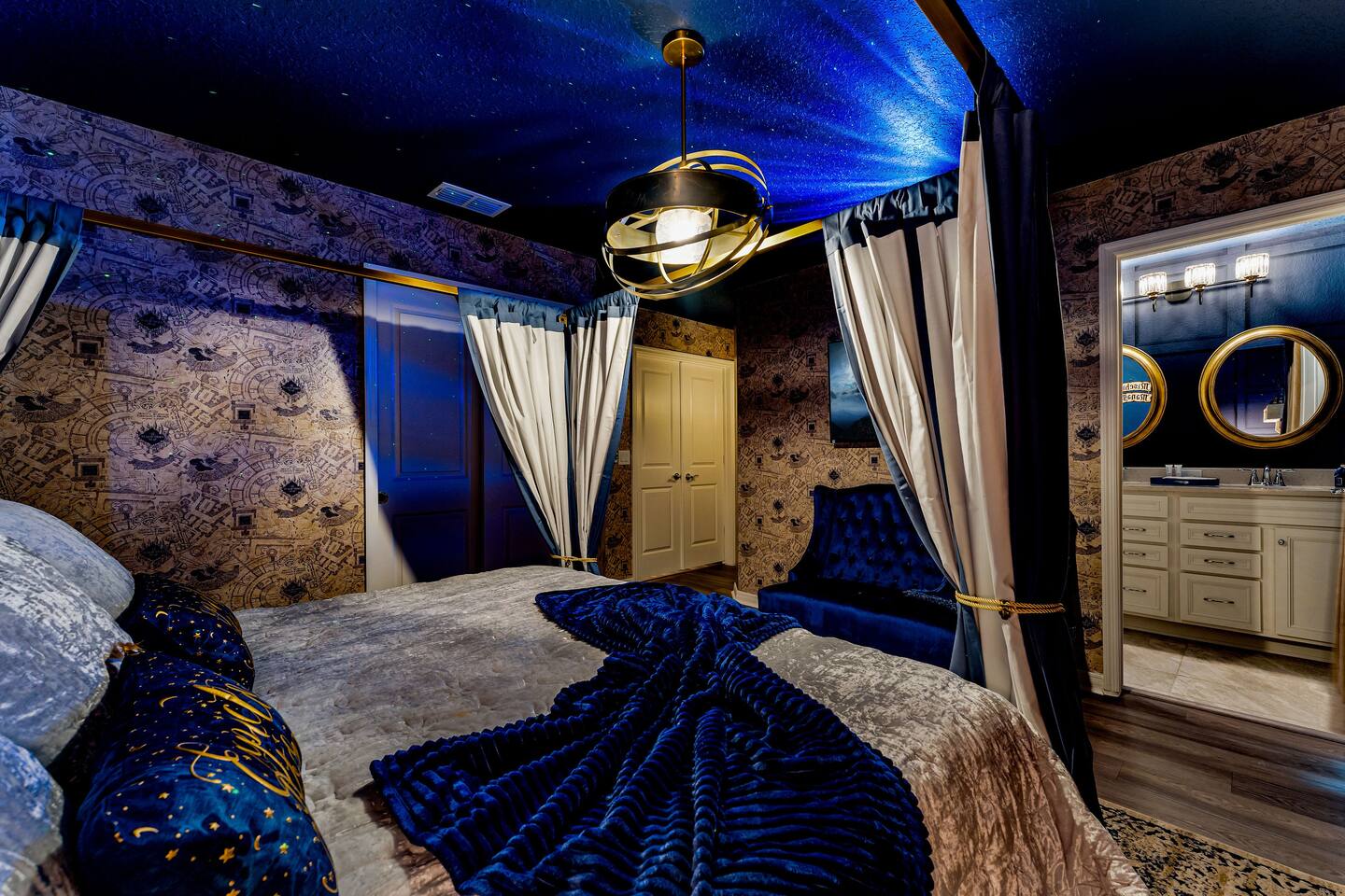 KEY FEATURES: ☀ 8 bedrooms – Themed Luxury Design! SLEEPS 17 ☀ Large family room; flat-screen smart TVs / GAME CONSOLES ☀ SUPER FAST high-speed internet ☀ Fully themed / Airconditioned Game Room ☀ 2 suites on the first floor ☀ Onsite washer + dryer ☀ Luxury gated community; Windsor Island ☀ Private Outdoor Lounge w / Bar; Pool + Spa with FREE pool HEAT (80°) ☀ Fully equipped kitchen; large dining area ☀ Fully accessible first floor ☀ Dedicated Workstation ☀ Free secured parking ☀ Full access to resort amenities; 140,000-gallon resort-style pool, water park, splash pad, arcade, fitness center, sports complex, marketplace, mini golf + more ☀ Complimentary children’s amenities; Pack n’ Play, highchair + more (**Must be requested 14 days before arrival**) ☆☆ BEDROOMS + BATHROOMS ☆☆ Guests of all ages are guaranteed to find the perfect bedroom in this spacious home. There are two bedrooms on the first floor, all are wheelchair accessible. The other 6 bedrooms are on the second floor along with a large loft. The first main-level bedroom features a king-sized bed, a flat-screen SMART TV, and a unique THRONE ROOM! This bedroom has an attached ensuite bathroom that leads out to the pool. The second main-level bedroom features a queen bed, a designated workstation, and a flat-screen SMART TV. The second story features a large loft with a game console and two TV's. There are 6 FULLY THEMED Bedrooms, all featuring SMART TVS and many unique additional amenities! All bathrooms are stocked with toilet paper, travel-sized soap, shampoo, conditioner, and plush towels. Please remember to stop at the supermarket to buy any other supplies you may need for your stay. ☆☆ KITCHEN ☆☆ • Fully-Equipped Kitchen: • Updated appliances • Ample counter space • Essential cooking utensils, blender, griddle + more • Coffee & Tea Station: • Keurig coffee maker • Electric Tea Kettle • Drip coffee maker • Island Seating for 4 • Outdoor Lounge Area and Bar • Formal dining table seating for 12 • Kitchen Starter Pack: paper towel, sponge, dish detergent ☆☆ LIVING ROOM ☆☆ Step into our inviting living room, a perfect blend of comfort and entertainment. It features a large Smart TV for your viewing pleasure, a large kitchen, and an Island perfect for entertaining guests! ☆☆ GARAGE / GAMEROOM ☆☆ The garage has been converted into an Avengers game room that the whole family is sure to love. Enjoy a vacation tournament of billiards, air hockey, or foosball. ☆☆ OUTSIDE SPACE ☆☆ Step outside onto the private patio and enjoy the lush surroundings. The screened-in south-facing patio is the perfect place to hang out after a long day at the parks. This luxurious area features a private pool and hot tub with a safety net for the kiddos and sun loungers for everyone to enjoy. Enjoy a night swim with our color-changing pool light! Pool heat set at 80 degrees (May–Sept) and 83 degrees (Oct – April) is included in your reservation, higher temperature can be provided for an additional cost. ★☆ Book Today & Let Us Take Care of You in Central Florida! ☆★