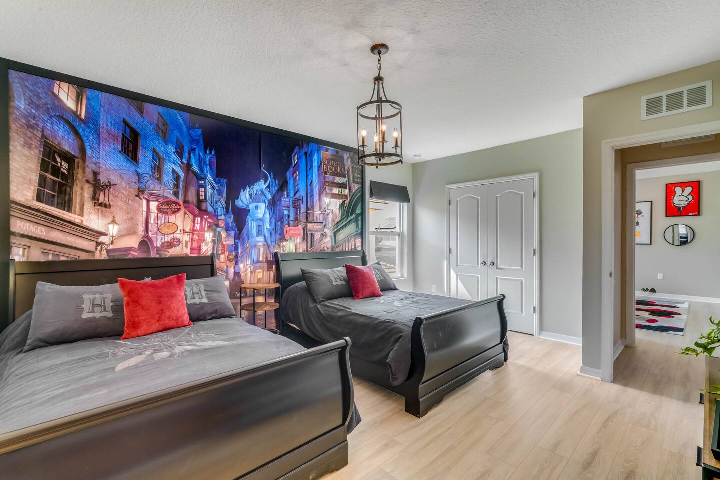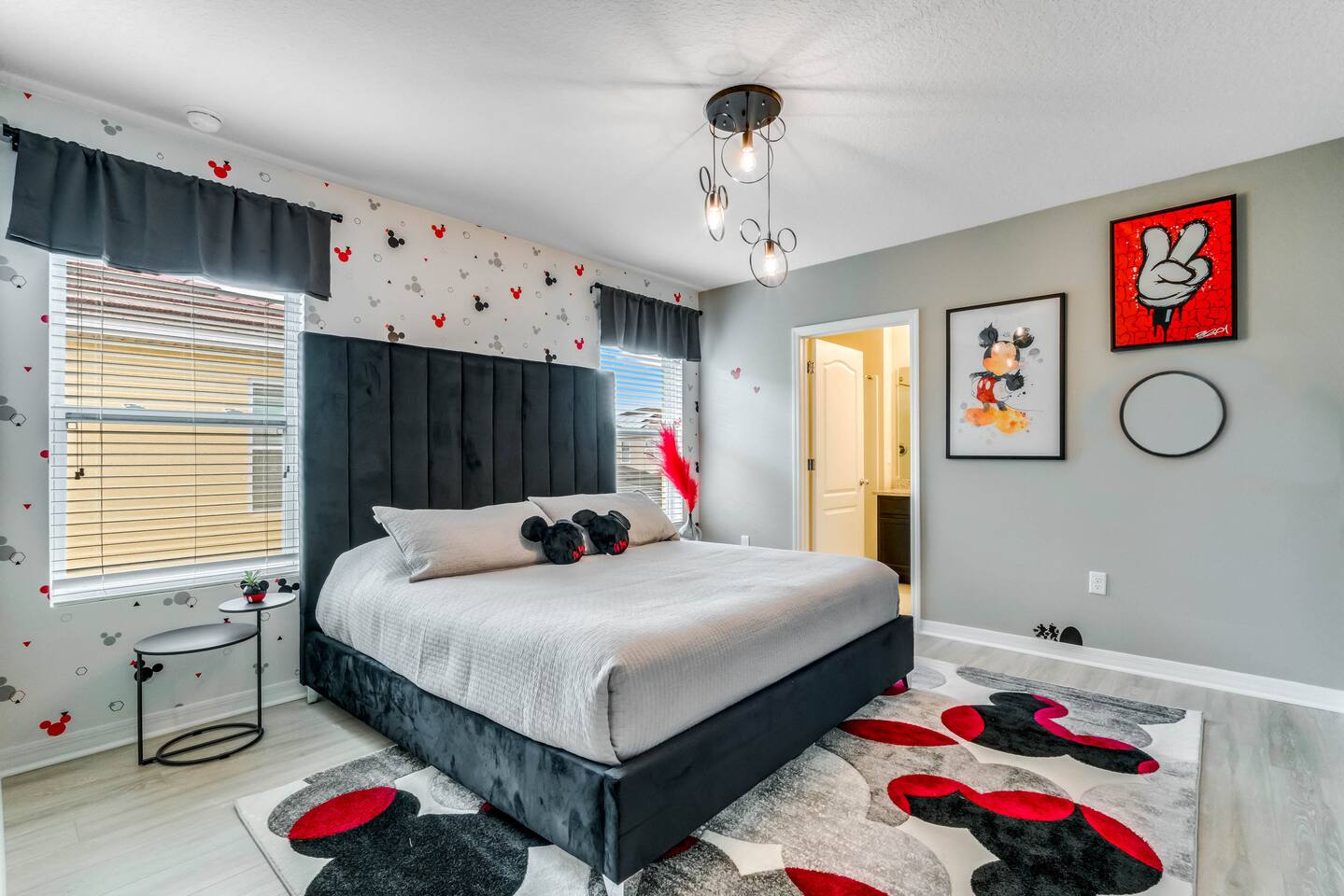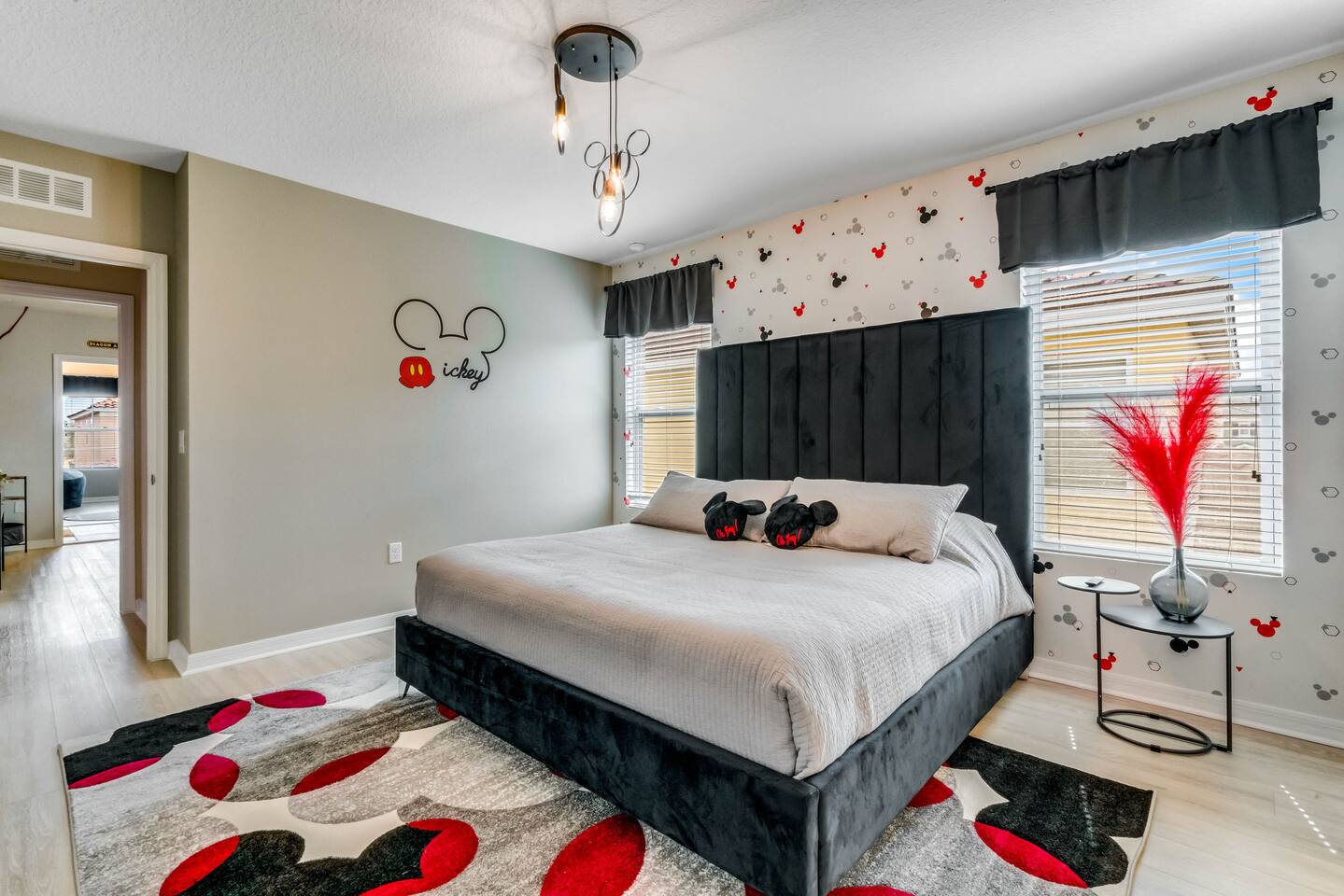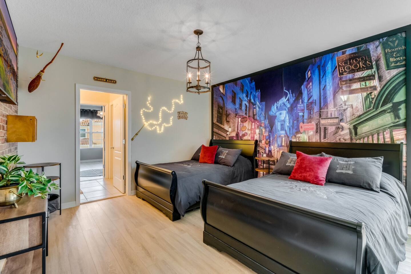 ☆☆ BEDROOMS + BATHROOMS ☆☆ Guests of all ages are guaranteed to find the perfect bedroom in this spacious home. There are two bedrooms on the first floor, both of which are wheelchair accessible. The other five bedrooms are on the second floor. The main-level bedrooms each feature a king-sized bed and flat-screen TV. Both first-floor bedrooms feature an ensuite bathroom and one offers direct access to the outdoor patio and pool area. There is also a detached half-bathroom on this floor. On the second floor, there is one bedroom with a king-sized bed. The remaining four bedrooms are incredibly decorated according to different themes tailored toward young travelers. The Harry Potter room has two full beds, the Alice in Wonderland has two twin beds, the Mickey room has one king-size bed, the Peter Pan room has 1 full-size bed, and the Star Wars room has a bunk bed with one full and one twin size bed. All bathrooms are stocked with travel-sized soap, shampoo, conditioner, and plush towels. Please remember to stop at the supermarket to buy any other supplies you may need for your stay. ☆☆ KITCHEN ☆☆ The fully equipped kitchen is sure to please the chef of your group. This spacious area boasts stainless steel appliances, ample counter space, and all the essentials for whipping up tasty meals for the whole family. There’s also a Keurig coffee maker to make your morning caffeine intake a breeze. Once it’s time to eat, you can cozy up to the kitchen island (seating four), eat as a group at the formal dining table (seating eight), or enjoy alfresco dining at the outdoor table (seating eight). You can seat 20 people across all the sitting areas, making this an incredible place for making memories while enjoying a meal with everyone. ☆☆ LIVING ROOMS ☆☆ Multi-family groups will find it easy to be together or get some privacy thanks to the two separate living rooms. There is one first-floor living room and one Mickey Mouse-themed loft. Both are outfitted with comfy sofas and flat-screen smart TVs. This home has so many places for people to quietly relax or gather and play together. You will find everyone is able to be refreshed and make memories for a lifetime. ☆☆ GARAGE ☆☆ The garage has been converted into a small game room that the whole family is sure to love. Enjoy a vacation tournament of air hockey, giant Jenga, or a basketball hoop game. ☆☆ OUTSIDE SPACE ☆☆ Step outside onto the private patio and enjoy the lush surroundings. The screened-in patio is the perfect place to hang out after a long day at the parks. This luxurious area features a private pool and hot tub with a safety net for the kiddos and sun loungers for everyone to enjoy. ☆☆ RESORT AMENITIES ☆☆ In addition to the amazing private outdoor space, guests can also take advantage of the incredible resort amenities. The clubhouse sits a few blocks from the home along with the water park and other resort amenities. Here is a short list: ☀ Resort-Style Pool heated from NOV-FEB. ☀ Private poolside cabanas ☀ Gym/Fitness Center ☀ Children’s splash area ☀ Lazy River ☀ Volleyball, basketball, and tennis courts ★☆ Book Today & Let Us Take Care Of You In Central Florida! ☆★