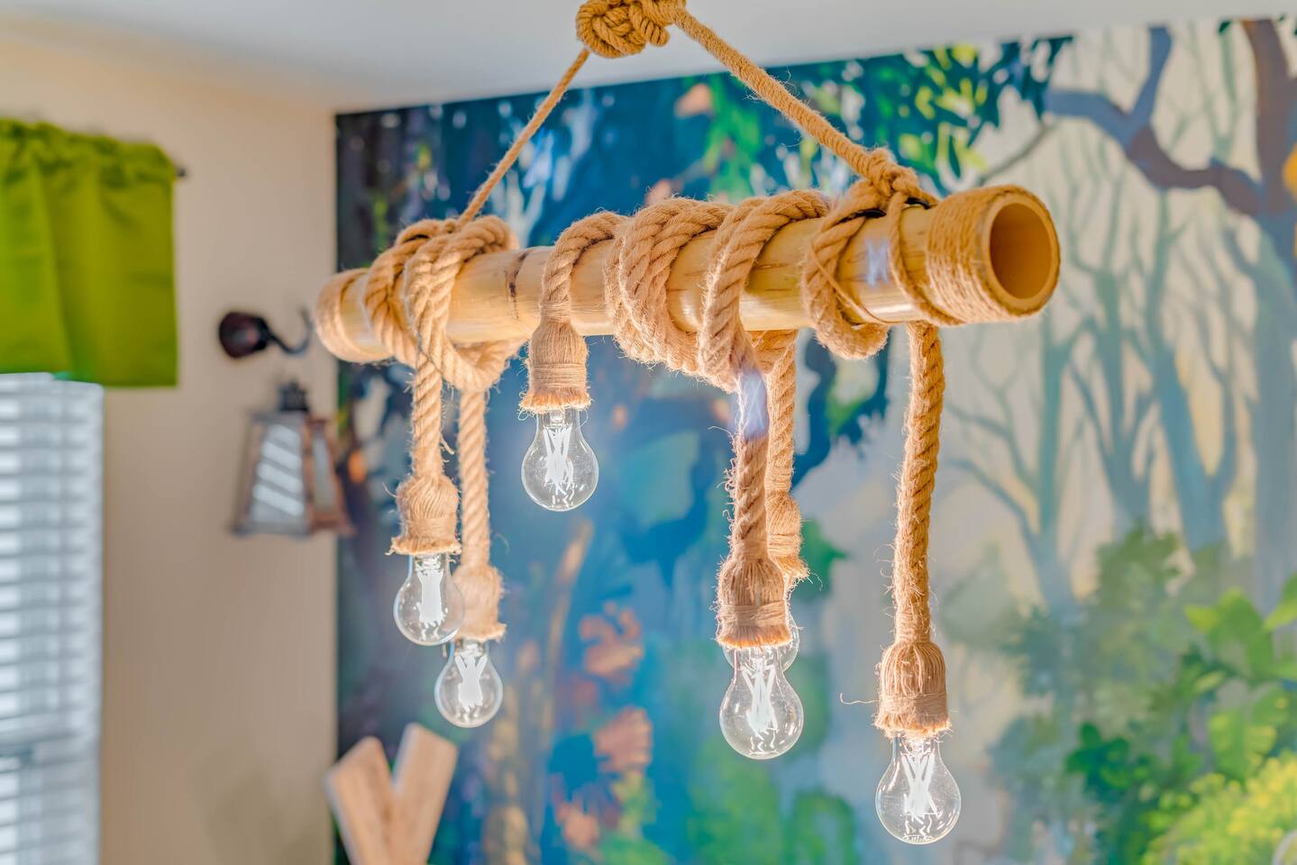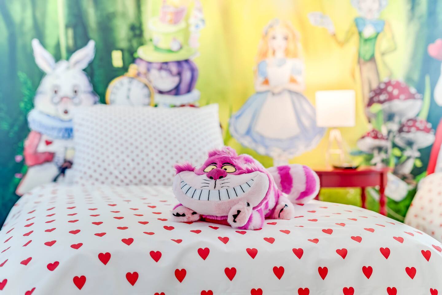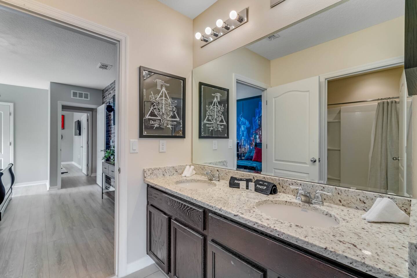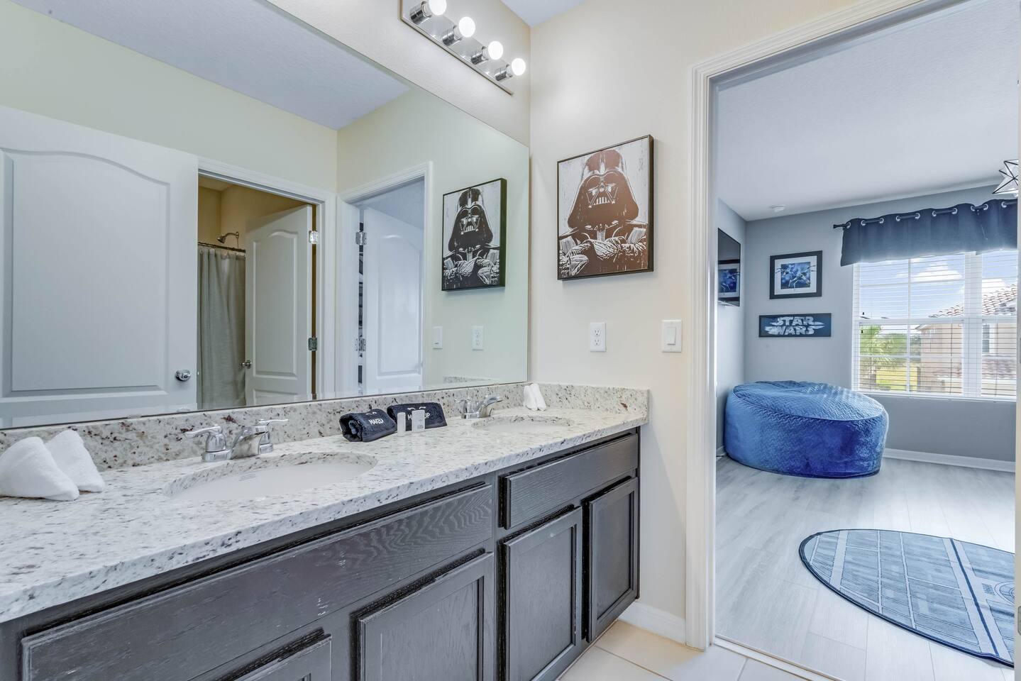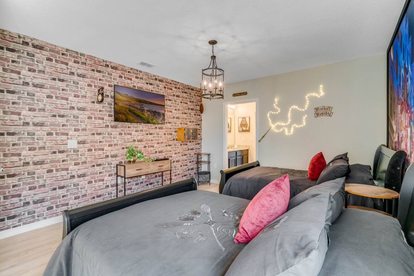 ☆☆ BEDROOMS + BATHROOMS ☆☆ Guests of all ages are guaranteed to find the perfect bedroom in this spacious home. There are two bedrooms on the first floor, both of which are wheelchair accessible. The other five bedrooms are on the second floor. The main-level bedrooms each feature a king-sized bed and flat-screen TV. Both first-floor bedrooms feature an ensuite bathroom and one offers direct access to the outdoor patio and pool area. There is also a detached half-bathroom on this floor. On the second floor, there is one bedroom with a king-sized bed. The remaining four bedrooms are incredibly decorated according to different themes tailored toward young travelers. The Harry Potter room has two full beds, the Alice in Wonderland has two twin beds, the Mickey room has one king-size bed, the Peter Pan room has 1 full-size bed, and the Star Wars room has a bunk bed with one full and one twin size bed. All bathrooms are stocked with travel-sized soap, shampoo, conditioner, and plush towels. Please remember to stop at the supermarket to buy any other supplies you may need for your stay. ☆☆ KITCHEN ☆☆ The fully equipped kitchen is sure to please the chef of your group. This spacious area boasts stainless steel appliances, ample counter space, and all the essentials for whipping up tasty meals for the whole family. There’s also a Keurig coffee maker to make your morning caffeine intake a breeze. Once it’s time to eat, you can cozy up to the kitchen island (seating four), eat as a group at the formal dining table (seating eight), or enjoy alfresco dining at the outdoor table (seating eight). You can seat 20 people across all the sitting areas, making this an incredible place for making memories while enjoying a meal with everyone. ☆☆ LIVING ROOMS ☆☆ Multi-family groups will find it easy to be together or get some privacy thanks to the two separate living rooms. There is one first-floor living room and one Mickey Mouse-themed loft. Both are outfitted with comfy sofas and flat-screen smart TVs. This home has so many places for people to quietly relax or gather and play together. You will find everyone is able to be refreshed and make memories for a lifetime. ☆☆ GARAGE ☆☆ The garage has been converted into a small game room that the whole family is sure to love. Enjoy a vacation tournament of air hockey, giant Jenga, or a basketball hoop game. ☆☆ OUTSIDE SPACE ☆☆ Step outside onto the private patio and enjoy the lush surroundings. The screened-in patio is the perfect place to hang out after a long day at the parks. This luxurious area features a private pool and hot tub with a safety net for the kiddos and sun loungers for everyone to enjoy. ☆☆ RESORT AMENITIES ☆☆ In addition to the amazing private outdoor space, guests can also take advantage of the incredible resort amenities. The clubhouse sits a few blocks from the home along with the water park and other resort amenities. Here is a short list: ☀ Resort-Style Pool heated from NOV-FEB. ☀ Private poolside cabanas ☀ Gym/Fitness Center ☀ Children’s splash area ☀ Lazy River ☀ Volleyball, basketball, and tennis courts ★☆ Book Today & Let Us Take Care Of You In Central Florida! ☆★